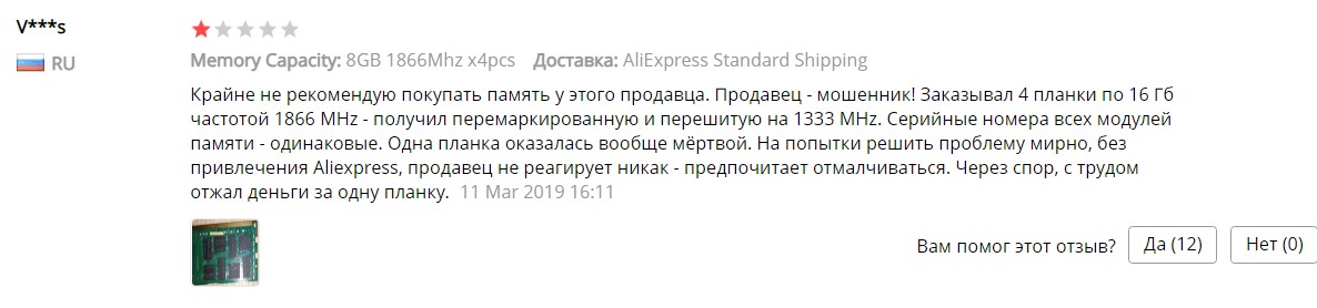 И я не знаю, именно с этим магазином у меня и у людей которые мне его рекомендовали, и тем кому я его рекомендовал, пока проблем не было, между прочим, я в нём тарюсь почти 2 года. Странно скорее то, что подобных негативных отзывов там единицы. Скинь плз ссылку на те лоты в которых ты нашёл эти отзывы, интересно что за бренд памяти они там брали с такими косяками.