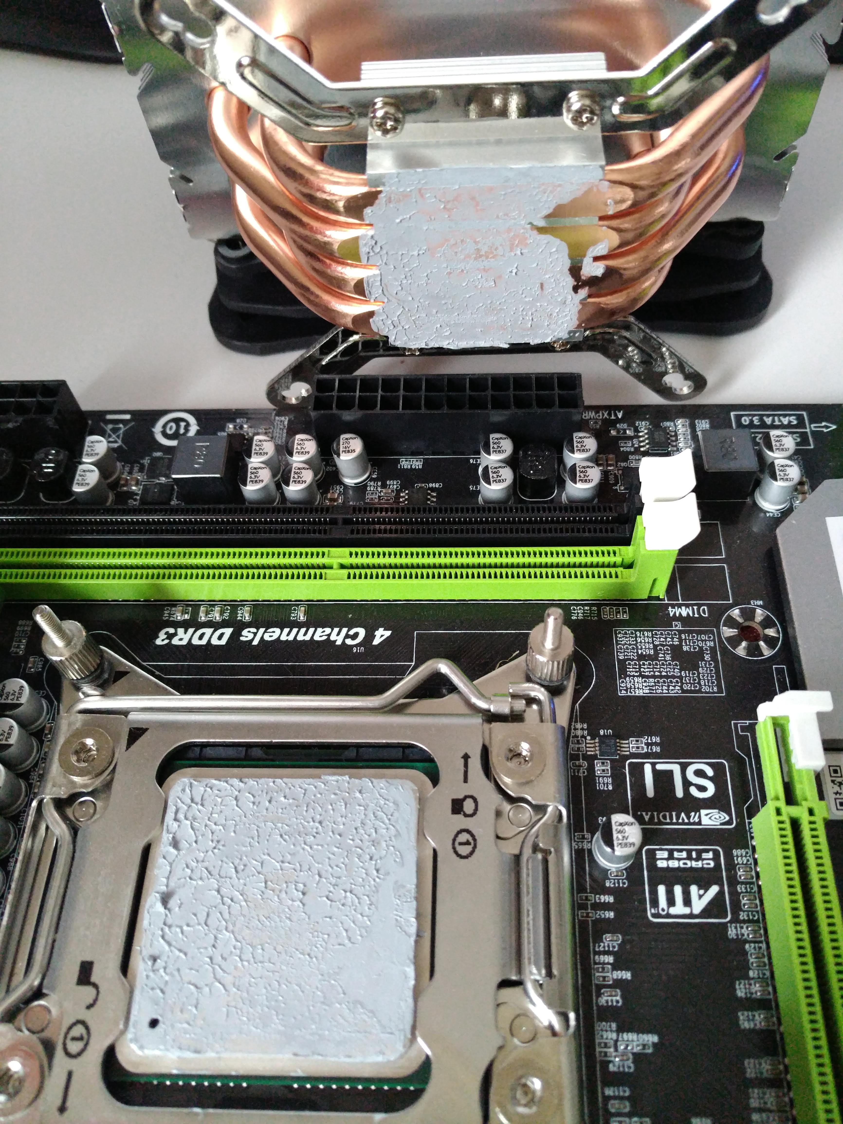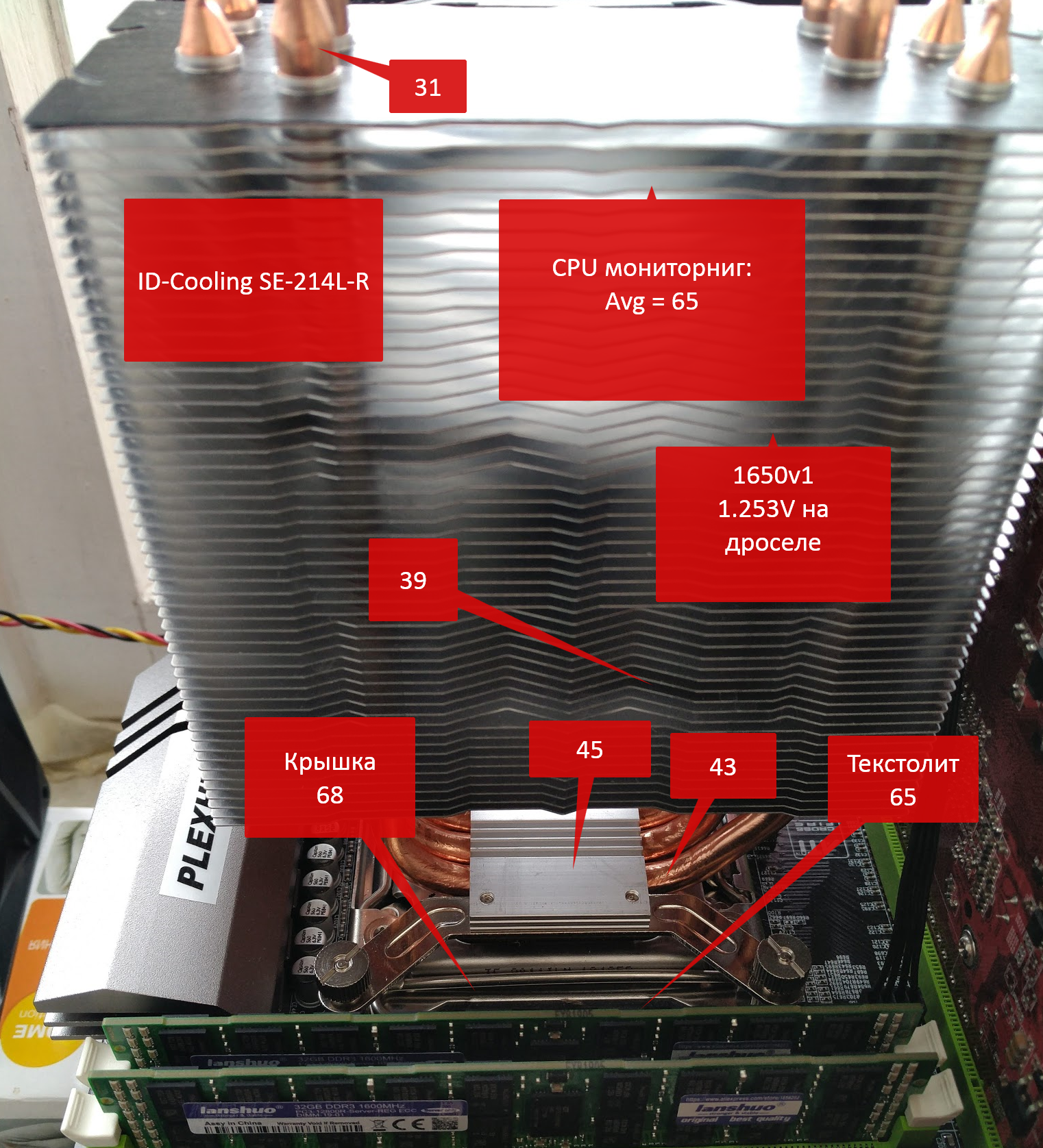 - проверьте качество поверхности прилегающей на крышку процессора, возможно нужно выравнивать и\или шлифовать - проверьте чтобы крепеж радиатора никуда не упирался (например в края крышки сокета) - не перетягивайте "лапы" крепежа, это может вызвать искривление плоскости прилегания - попробуйте другую термопасту - как вариант просто переверните радиатор на 180 градусов. Вообще для 1650 в разгоне лучше использовать не 4х трубочные кулера, а 5-6, где нет зазора между трубками в плоскости прилегания к крышке процессора.