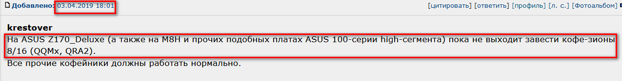 ANT_ Если коротко - то все сложно.) Речь только о платах ASUS 100 + Xeon: - 16-ти поточные Xeon нельзя завести на топовых платах Z170 (например M8-серия, Z170-Deluxe, Z170-A), т.к. на 2к биосах (нужно для 16 потоков) отключение МЕ (нужно для Xeon) приводит к неработоспособности системы. Но отключив HT, все нормально заработает на 3ххх биосе (там нет проблем с отключением МЕ). Можно предсказать заранее с высокой долей вероятности. И да, Z170-ProGaming - не топ, поэтому и работает с QQM6.) - 12-ти поточные Xeon на 3ххх биосах некоторых материнок имеют неприятный "one_boot_bug", когда система первый раз нормально грузится в Windows, а после перезагрузки перестает нормально работать. Предсказать заранее пока нельзя. Если у платы нет проблем с отключением МЕ на 2ххх биосе - то можно использовать его, там этого бага нет. Баг присутствует: H170/Z170-ProGaming, Z170-A/AR Баг отсутствует: M8H, M8G, Z170i-ProGaming