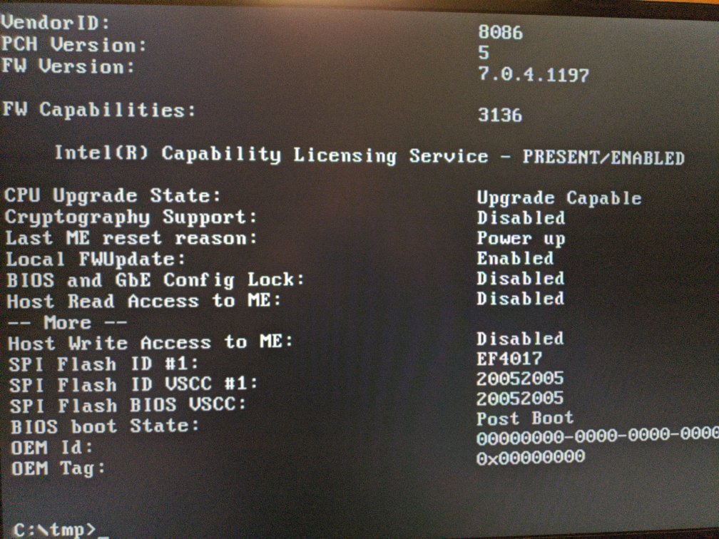 Добавлено спустя 8 минут 39 секунд: Скачайте ME 7 1.5MB v7.1.80.1214.rar, распакуйте и переименуйте в me.bin. Найдите FWUpdate версии 7.x для DOS. Загрузитесь в DOS и выполните: FWUpdLcl -f me.bin После прошивки обязательно выключите компьютер кнопкой, не перегружаясь. Отсоедините шнур питания на пару минут. Потом снова загрузитесь в DOS и покажите результаты MEInfo.