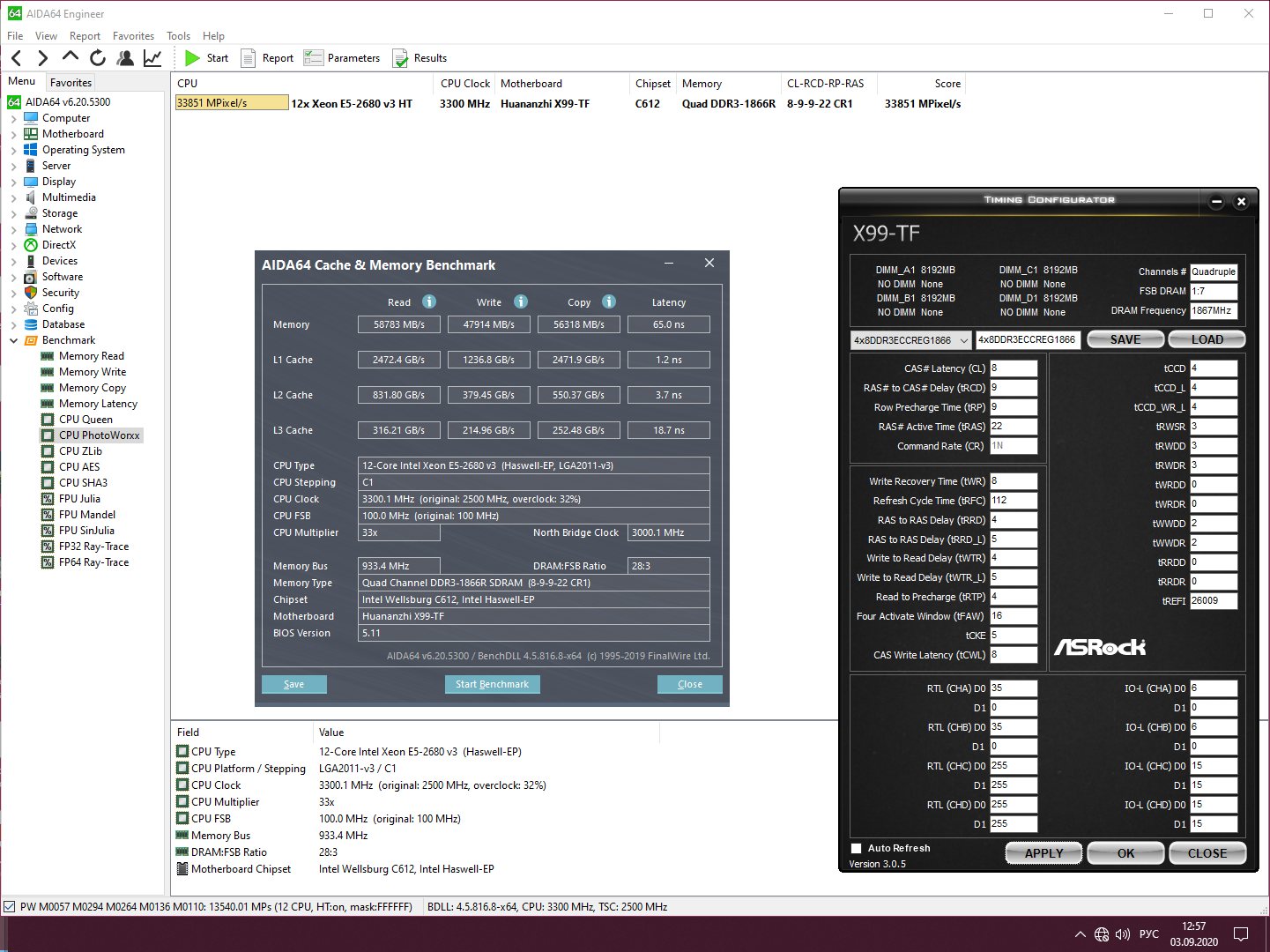 TF c Xeon 2678v3 на свежеустановленной Windows 10 с фиксированными 100мгц. в режиме 2133 (12-12-12-28 CR1 остальное по 0) Memory Read 63144 Write 47748 Copy 59309 Latency 75.8 Aida Benchmark CPU PhotoWorxx 34131Mpixel/s