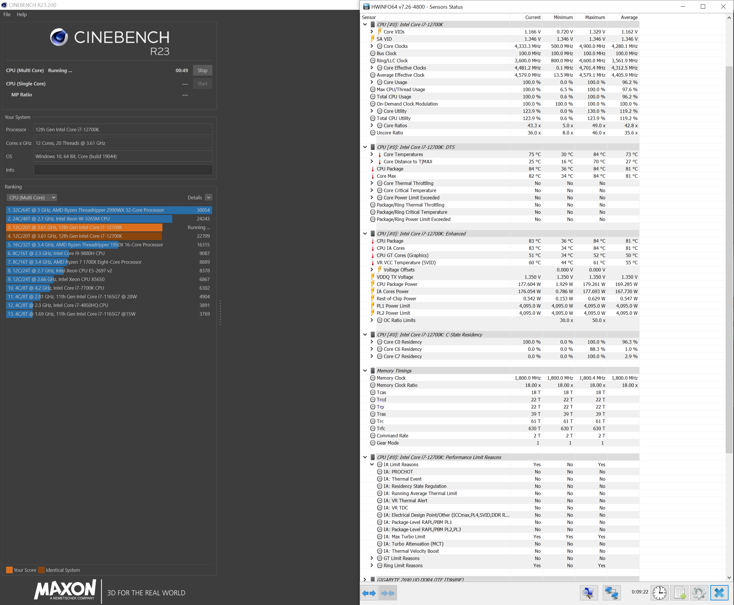 Конфигурация Gigabyte Z690 UD DDR4 / i7 - 12700K / Noctua NH-U12A / 64Gb DDR4 Kingston FURY Beast Black RGB 3600 18-22-22 (KF436C18BBAK2/64) / MSI RTX 3060 TI VENTUS 3X 8G OC LHR. Результаты после прогона 10 минут Cinebench multicore на скриншоте. Обратил внимание, что во время прогона Cinebench частота P-ядер была максимально 4700, Е-ядер - 3600. Правильно ли я понимаю, что это связано с тем, что потребляемая мощность уперлась в лимит (была в максимуме 178 Вт). Где этот лимит устанавливается, ведь по спецификациям Интел максимальная мощность в режиме Turbo для данного процессора - 190 Вт. В Биосе у меня все по умолчанию в части процессора. И стоит ли этот лимит на моей системе увеличивать, учитывая температуры (макс по CPU было 83 градуса)? На втором скриншоте второй прогон с hwinfo64, на десятой минуте работы бенчмарка, там результат получился даже чуть побольше - 22 773.