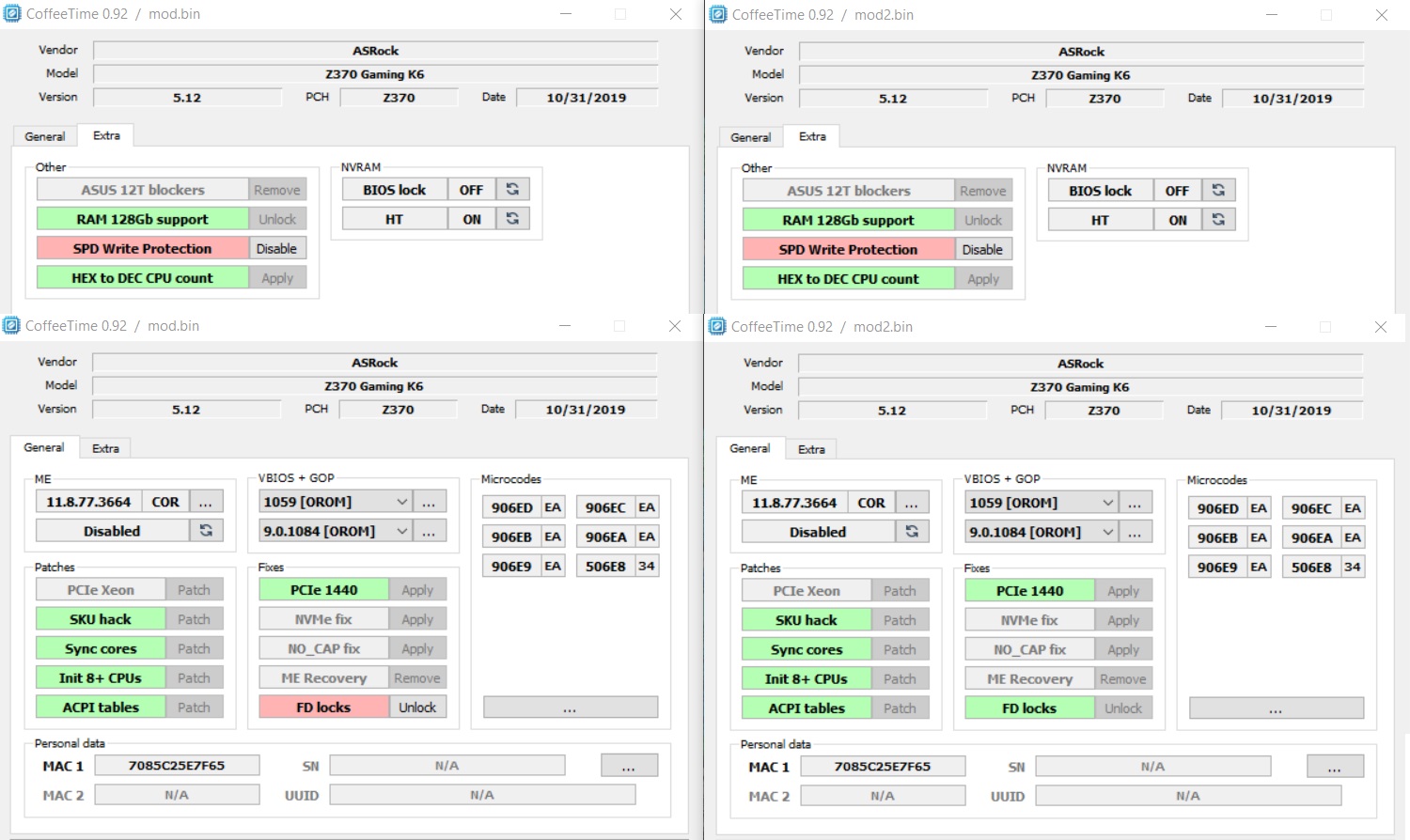 Для плат на базе чипсетов Z370, B365 и H310C можно добавить поддержку процессоров Skylake и Kaby Lake. Для этого достаточно понизить версию МЕ и добавить необходимые микрокоды.