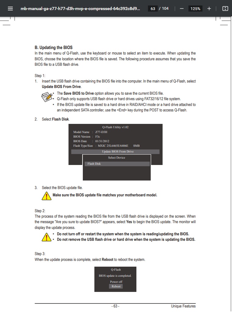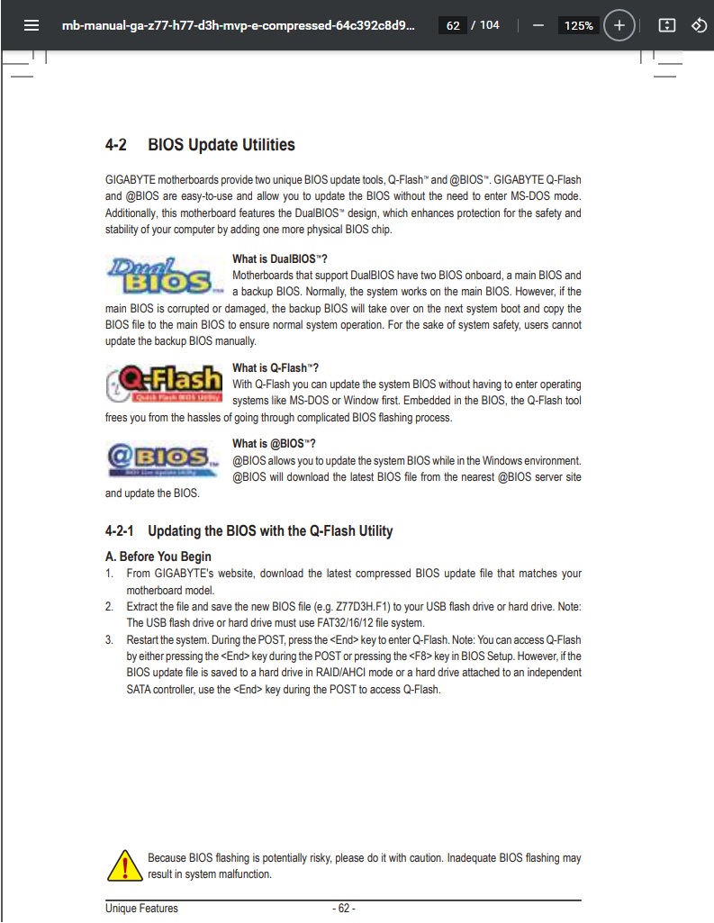 При включении ПК, в процессе циклической перезагрузки, иногда, не помню, раза с 10-20, само (ничего не нажимая) выскакивало окно с что-то там Q-Flash? Возможно надо флешку с переименованным BIOS (как там в инструкции от платы Z77D3H.F1 или как) подсунуть, в нужный usb разъем (на самой плате), и тогда запустится восстановление через Q-Flash. Я так предполагаю, q-flash и DualBios это разные способы восстановления, а программатором это вообще отдельный способ. Или, может, записать тот дамп с повреждением только на микросхеме MainBIOS, а на микросхему BackupBIOS записать скачанный с сайта gigabyte BIOS, но такой же версии. И, может он сам после перезагрузки восстановит и MainBIOS, перезаписав недостающие данные. Хотя, надо конечно знать, как эти технологии работают, чтобы понимать, при восстановлении с BackupBIOS, полностью он перезаписывает данные, или только поврежденные части. Как работает GIGABYTE DualBIOS™? https://www.gigabyte.ru/global/ru/pages/mb_081226_dualbios/tech_081226_dualbios.htm?ysclid=mg9hpop7d9249602144#top