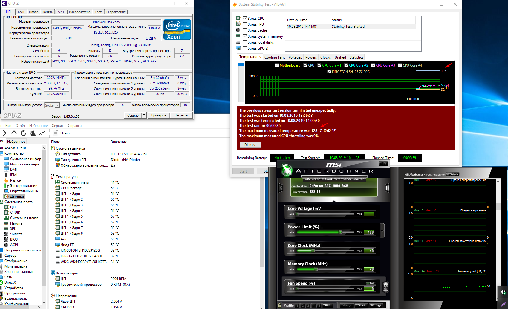 будьте добры, гляньте пожалуйста https://valid.x86.fr/tew52a , собрал пк , айида показывает 128 градусов температуру цп всегда, прошивал биос сначала от "купи дешего", потом с шапки -> не помогло но фризы при разгонее до 1833 ушли, установил последнюю винду 10 бсоды ушли