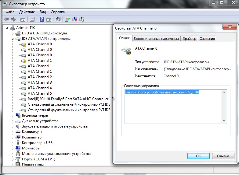 Всем привет! Друзья постигла меня вот такая беда... Отвал ATA Chanel 0 и 1 Но DVDRW на IDE работает! Удаление и попытки обновить драйвер(а оно не требуется ) не помогает При отключенном шлейфе изменений не наблюдается Всё ... приплыли? Винт пока не пробовал подключать...