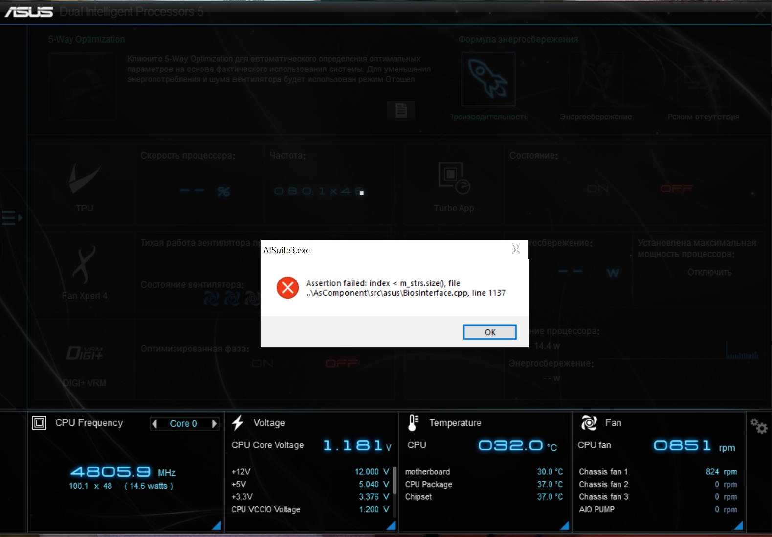 Продолжаю бороться с AI Suite 3 :пробовал все версии подряд,3.00.13 начала выдавать другую ошибку,касаемо Fan Expert (почему-то данная версия не поставила его автоматом),взял данный плагин с другой версии.Приложение начало запускаться.БИОС сбросил.