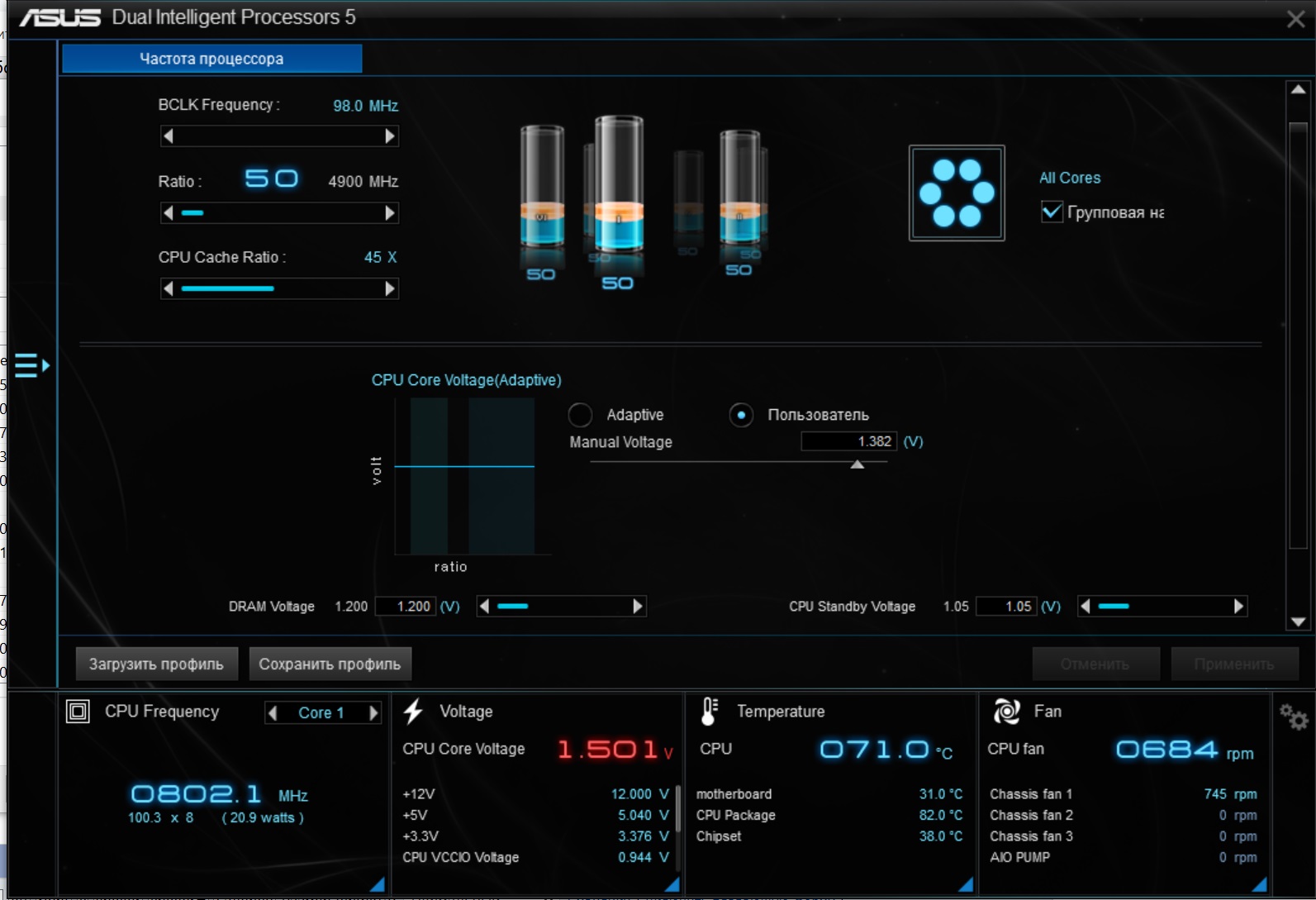 Попробовал выставить в "мануале" напряжение и частоту.Частота BCLK сразу уползает на 98,по ядрам на 4900 в стресс-тесте "Аиды" тоже не держит,частота на уровне стока.Вольтаж при этом лупит по максимуму.