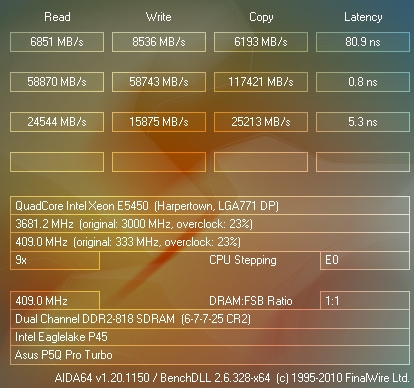 Еще заинтересовали темперы северного и южного моста, так как до этого не обращал на них внимания, каковы их приделы на плате p5q-e? В простое северник 40-50С. В моем лайтовом разгоне 3.63ghz в прайме среднее 63-65С, макс 67С. Я так понимаю я подошел уже к максимальной отметке в 70С? Для теста запустил с гейловскими планками конфу на 4.03ghz, синебенч поставил рекорд, 438 очков. Но прайм95 гонять не стал, северник был около 70 градусов по сути без нагрузки.