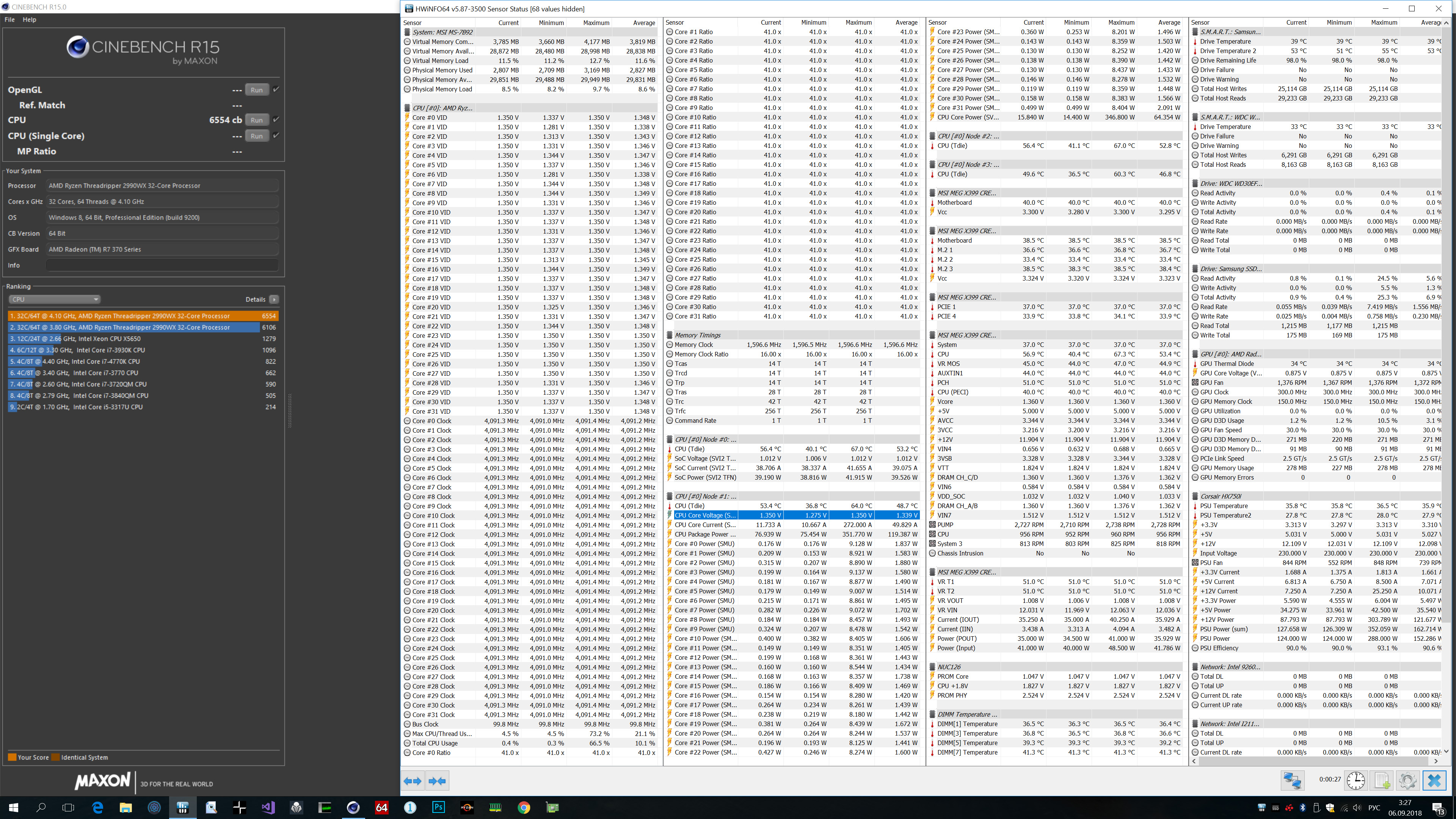 MSI MEG тянет 2990WX @4.1 без экстрим охлада 6554 попугаев CB15 Конечно мне сложно до сих пор поверить что там 4 проца 2700Х Кристаллы действительно отборные , 351W на это все хозяйство, при том что обычный мой 2700Х на 4.1 уже 170 имеет