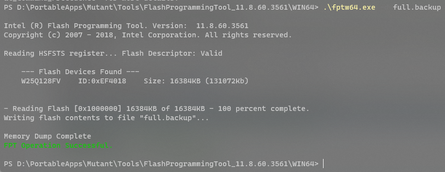 cd /d _полный_путь_к_папке_с_FPT_в_кавычках_ // для перехода в рабочую директорию fptw64 -d full.backup // полный дамп биоса fptw64 -gbe -d gbe.backup // дамп только региона GbE fptw64 -bios -d bios.backup // дамп только региона BIOS