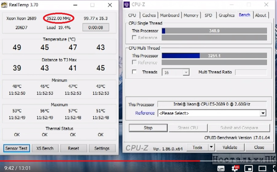 ролике Е5 2689 и частоты буста на 2.6ггц и 3,5 ггц на стоковом BIOS Kllisre X79.