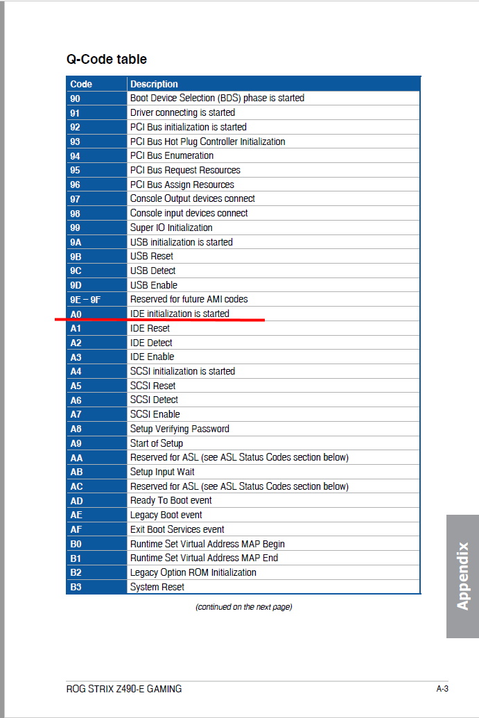 код показывающий инициализацию IDE контролера жестких дисков, которого нет на плате. Коды ошибок стандартизированы, по этому они лет двадцать не менялись(когда еще IDE устройства - жесткие диски, CD/DVD приводы и пр. широко использовались). По простому, этот код показывает, контролер загрузочного диска исправен. На моей плате этот код горит всегда, после старта материнской платы. На второй профильной 10 летней пишущей машинке, точно так - A0, после инициализации мат.платы. У себя в биосе можешь поменять отображение кода, на температуру процессора.