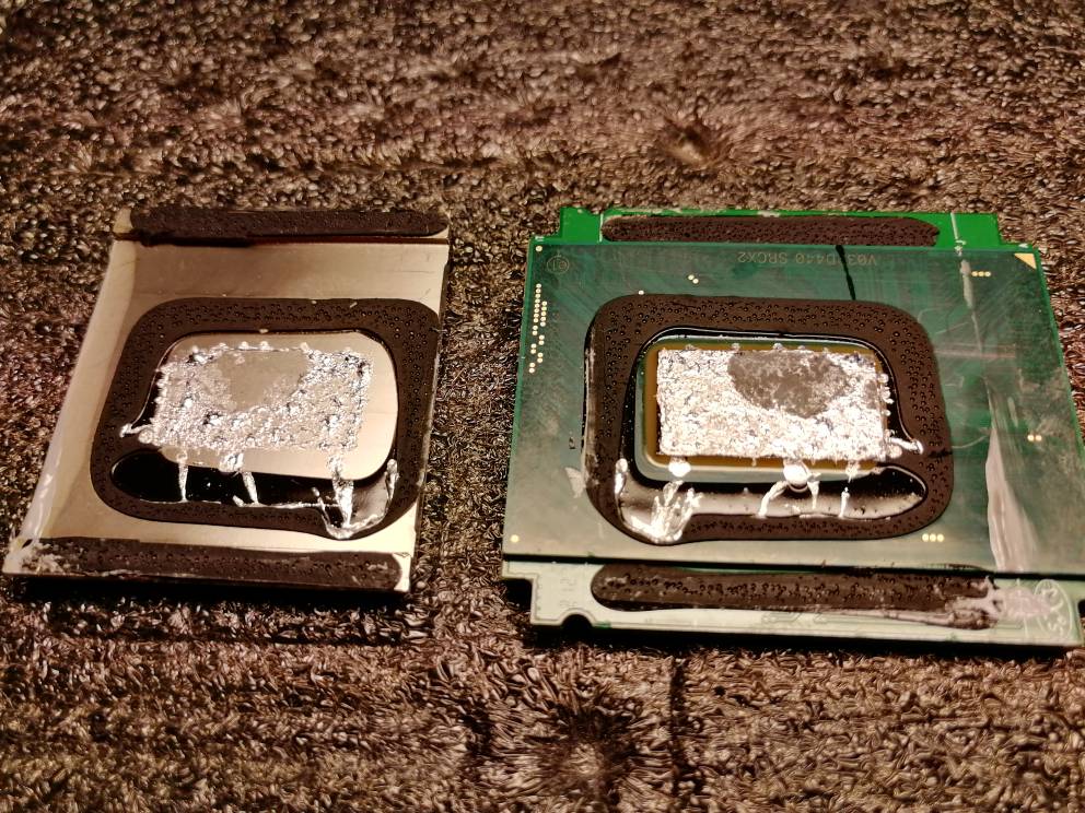 KrAzY заметьте, как жидкий металл разъедает герметик, и чем это сулит потом. И ещё под герметиком находятся некоторые технологические контакты, а вот заизолированы ли они, большой вопрос. Сам заказал 9980HK, и в ближайшем будущем будет обзор китайской богодельни, и не только от меня. Повелись на людей, которые толком не тестили ничего с ним.