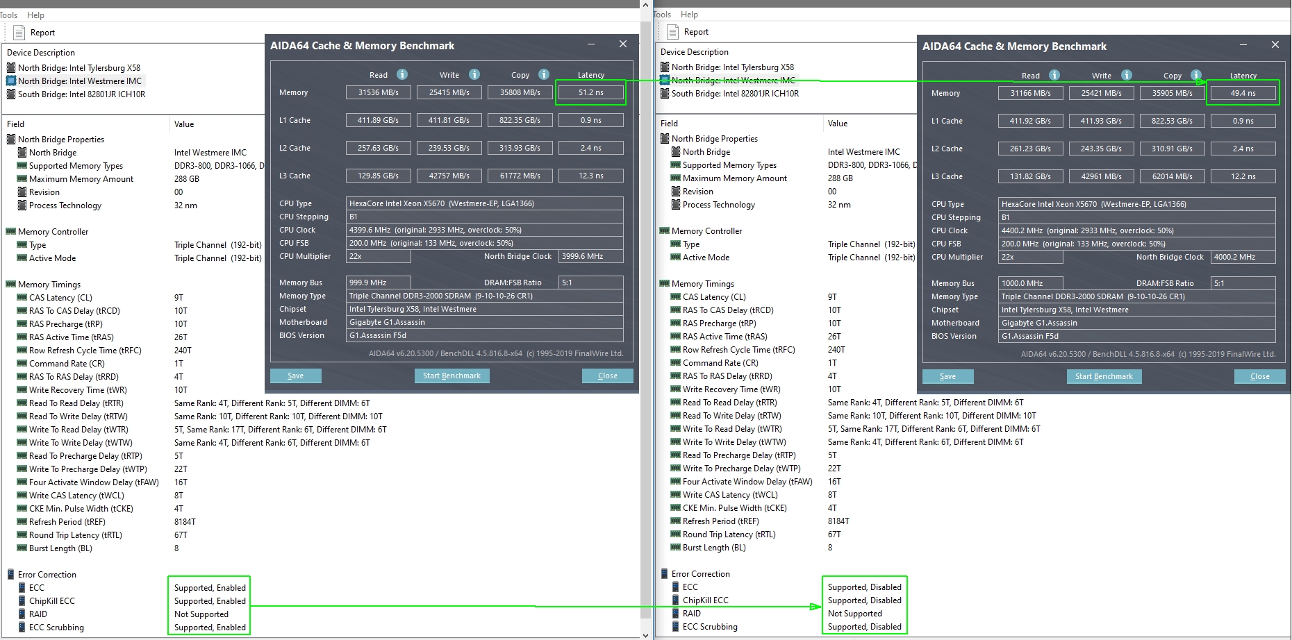 С разгоном двуранговой памяти все очень плохо. Samsung T-die 2666 2x8Gb нормально работает только на частоте 2800Ghz, изредка удавалось запустить на 2900, но с задиранием SA/IO и без стабильности даже на JEDEC профиле. Повышение boot-напряжений картину не улучшает. Одна планка T-die смогла в 3000. При этом старые дешманские одноранговые Samsung C-die 2400 2x4Gb нормально завелись на 3200. Не знаю, могут ли они в принципе больше или это их потолок, но тенденция очевидна. Чуток радует только то, что в тесте аиды двуранги 2900 почти идентичны однорангам 3200, а так же то, что ужав тайминги можно сохранить те же задержки, что были ранее на более высоких частотах.