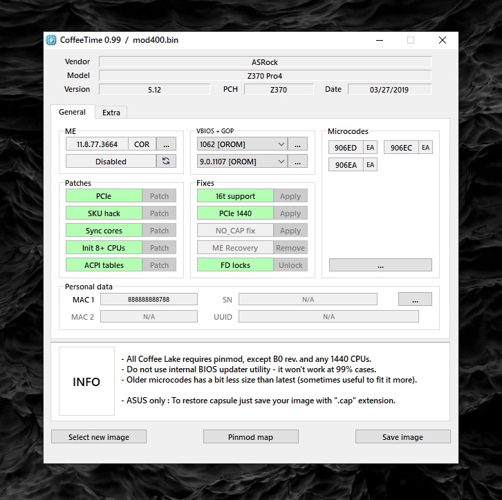 Доброго времени суток. На почте меня ждет srfd0 в системнике его ждет Asrock z370 pro4 и вот мой список вопросов: Дамп биоса нужен только для того, чтобы перенести mac адрес в модифицированный биос, но это не обязательно? Как понять, что сервисный режим при замыкании контактов у аудиочипа успешно активирован? Кофе тайм показывает статус ME disabled, значит после прошивки команда "fptw64 -greset" не сработает и, следуя инструкции, после прошивки нужно вынуть батарейку и обесточить систему? Батарейку ведь на выключенном компьютере вынимать надо, правильно? Если я все же окирпичу материнку прошивка с помощью программатора поможет? На скриншоте все верно сделано?