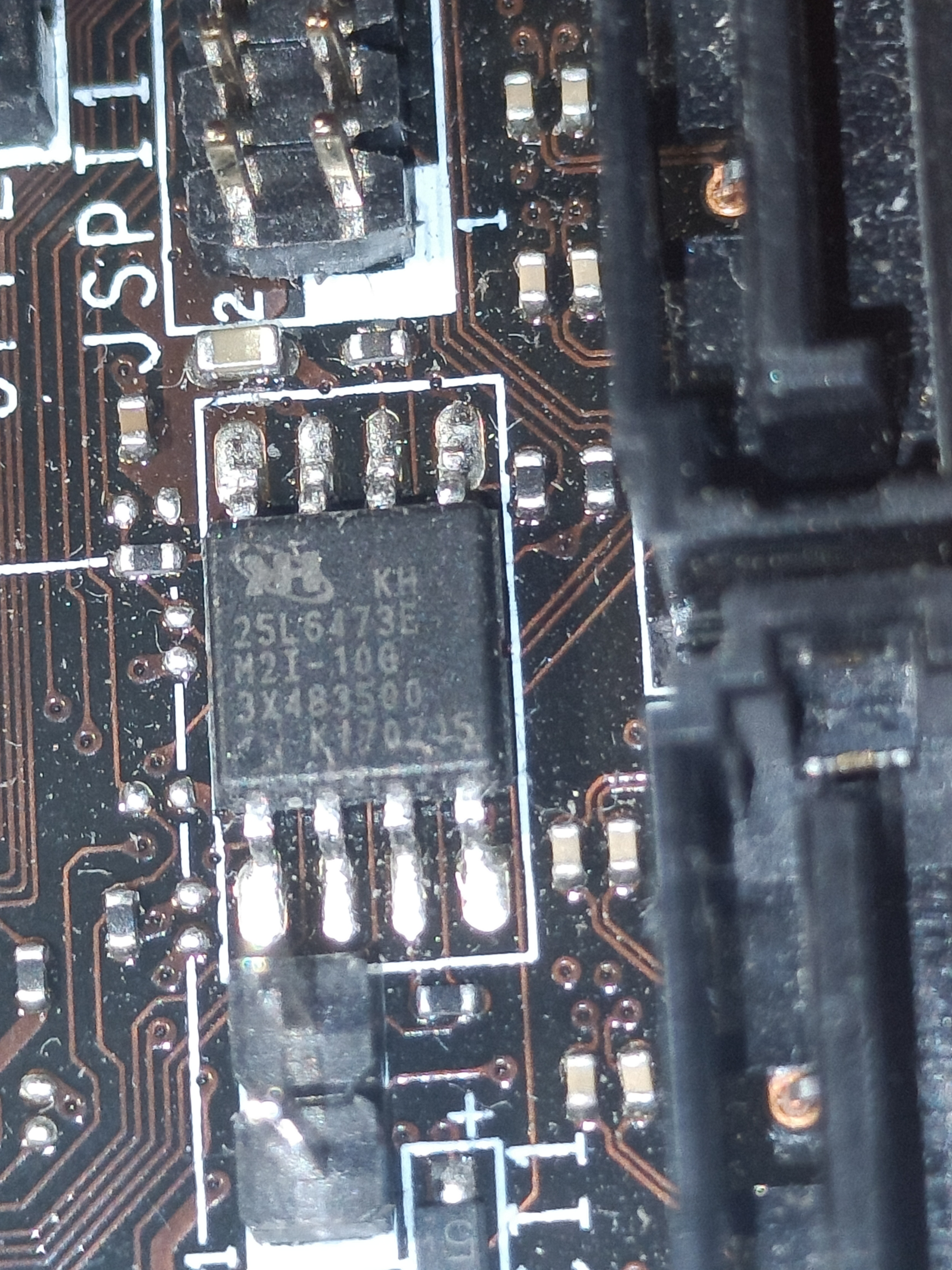 Здравствуйте еще раз, а каким образом Вы прошивали флешку биос? Прямо щипцами или выпаивали? Вчера щипцами пробовал и там мешал радиатор. Снял, теперь мешает sata порт. вот микросхема и как она крепится. Держатся щипцы очень не плотно, одно движение и они отваливаются от микросхемы. Пользовался программой AsProgrammer 2.13 fix, которая скачана на 4pda. Все в FF. При этом загорается желтый светодиод при начале считывания схемы. Блок не замкнут перемычкой. Как есть подключен. FSP PNF 300W. При нажатии кнопки ПК, материнка стартует. Все вытащено. Только блок и мать. Подключены: 24пин блок + 4 пин на проц
