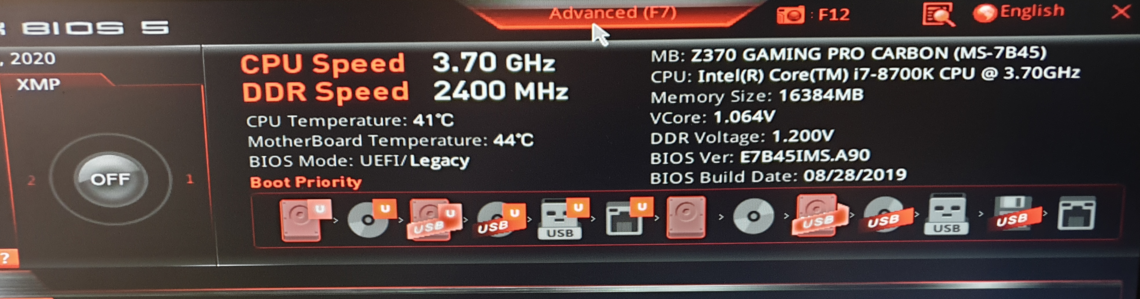 to extream_09 Это фото точно при всех настройках в BIOS в полном дефолте? Есть сомнения. Можете ли еще полчаса потратить для абсолютной уверенности и сделать следующее? 1) Поставить предпоследний BIOS. 7B45vA9 (https://download.msi.com/bos_exe/mb/7B45vA9.zip). Ничего в BIOS не трогать! Фото сюда. 2) Поставить еще раз текущий BIOS. 7B45vAA (https://download.msi.com/bos_exe/mb/7B45vAA.zip). Ничего в BIOS не трогать! Фото сюда.