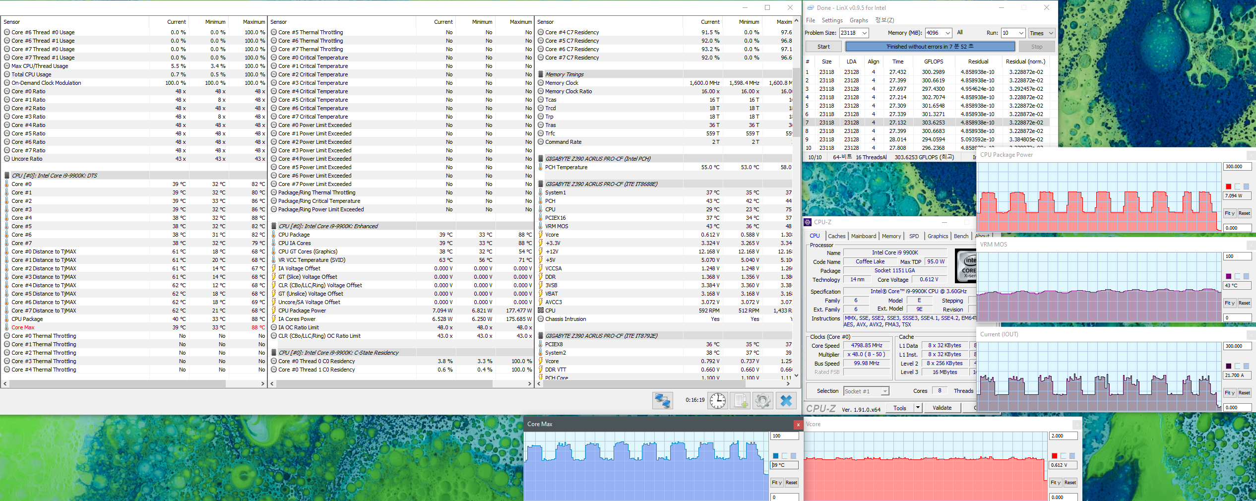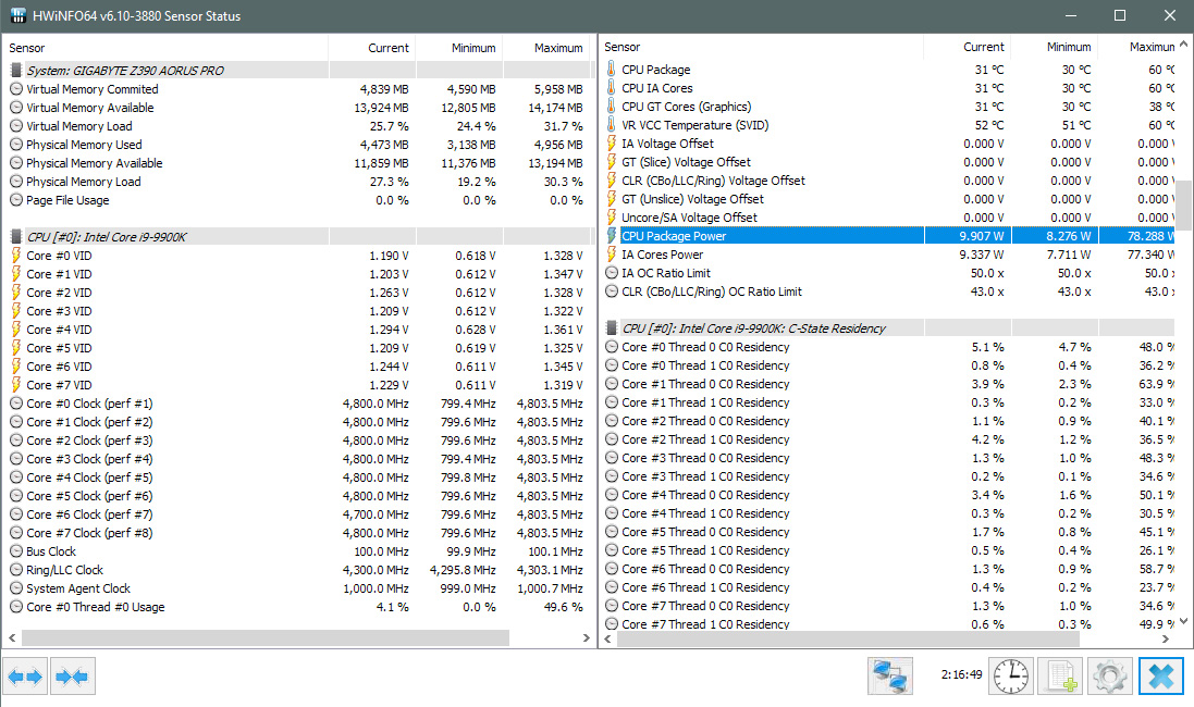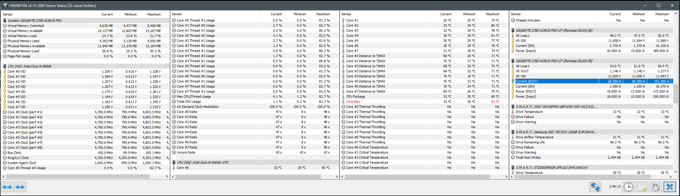 пока что на AUTO: меньше 10 ватт в простое, под fpu stress - 165 ватт + вечером доберусь попробую еще раз ручной разгон.. извиняюсь, а как ток на проц посмотреть ? и на что обращать внимание по току?