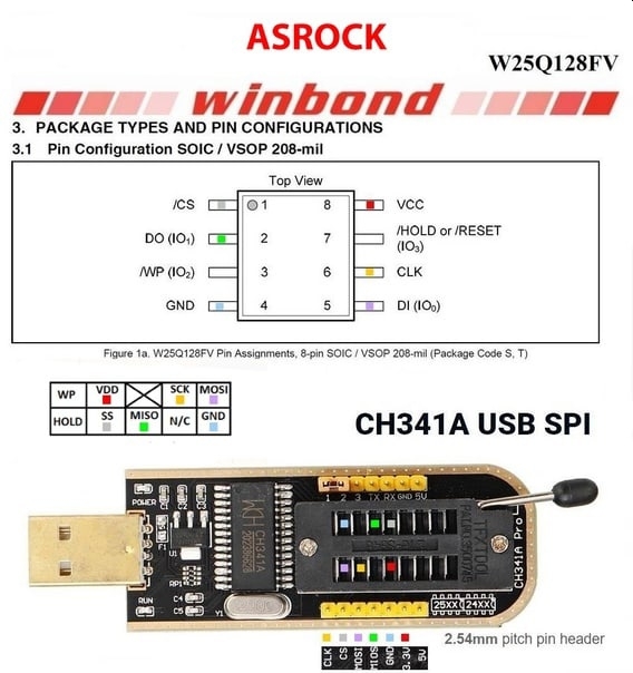 Для микросхем, распаянных на материнской плате, потребуется прищепка (SOIP8 clip) или поконтактное подключение к разъему JSPI (при наличии).