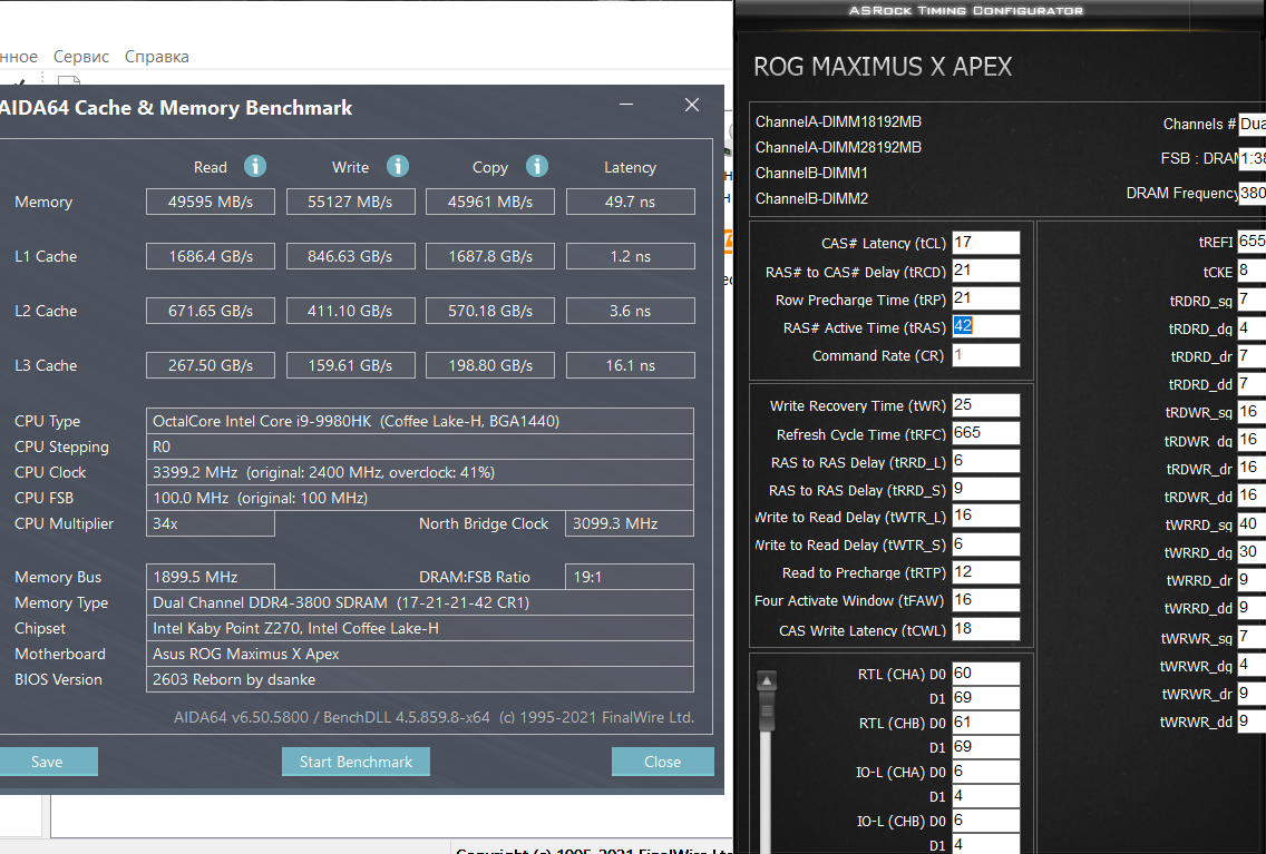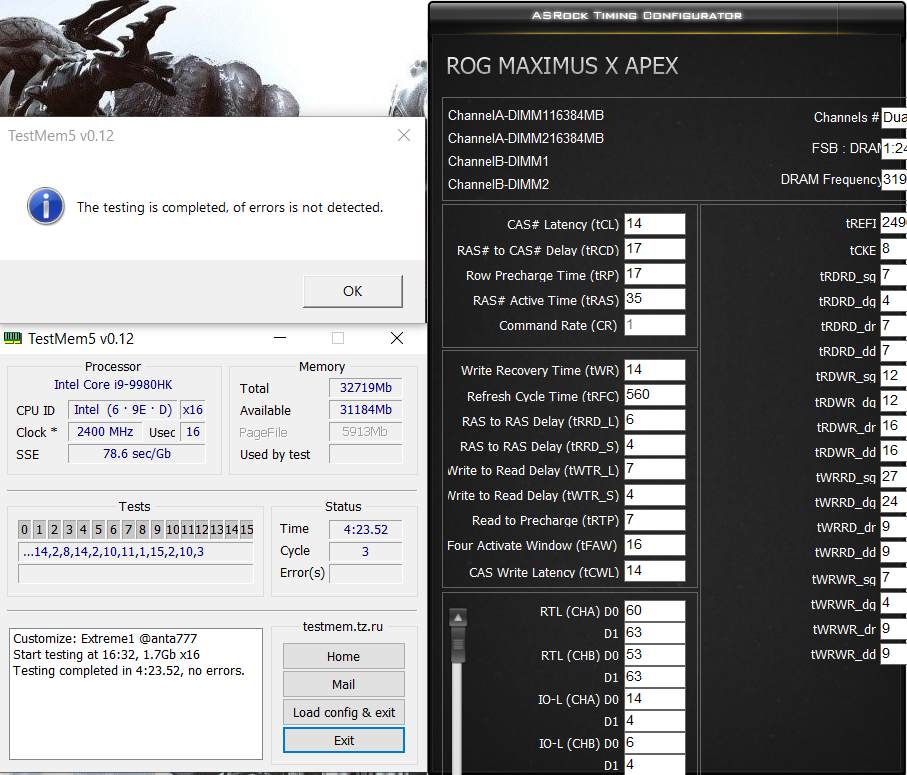Всем привет! для статистики может кому то будет полезным, srfd0 c крышкой(chipset store) результаты разгона озу на материнке apex9 : 1)двуранг балики у4 2*16gb взяли только 3200 14-17-17-35 с проверкой экстрим в мемтесте 4.5ч 2)балики у4 2*8 одноранги, без проверки(2 минуты суперлайт мемтест без ошибок) 3800 17-21-21-42(просто нет времени на проверку) Для себя решил оставить 32гб, а то получается зря покупал.