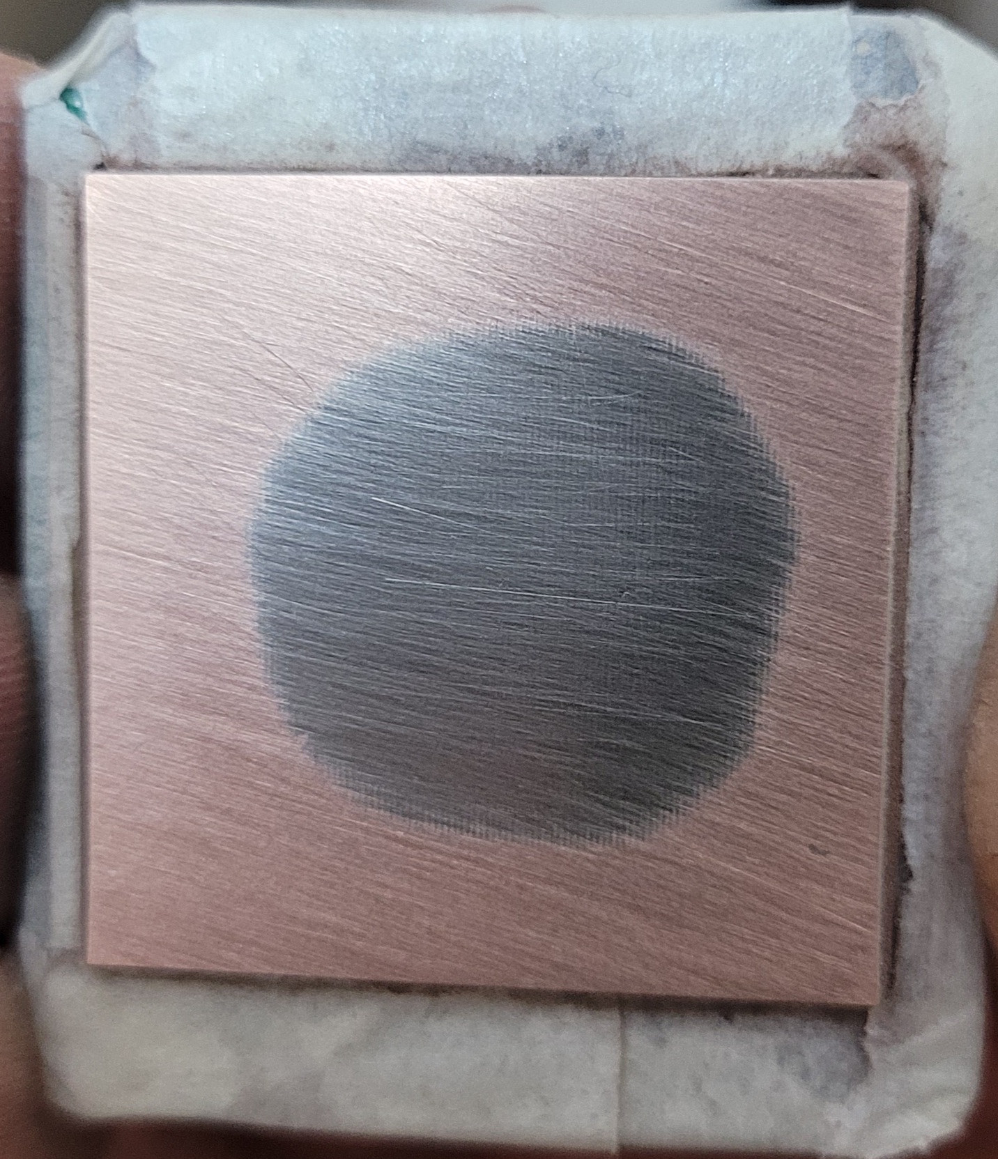 смещение центра кристалла относительно центра сокета около 2,5 мм желтый круг показывает, как медный сердечник 28 мм становится на кристалл