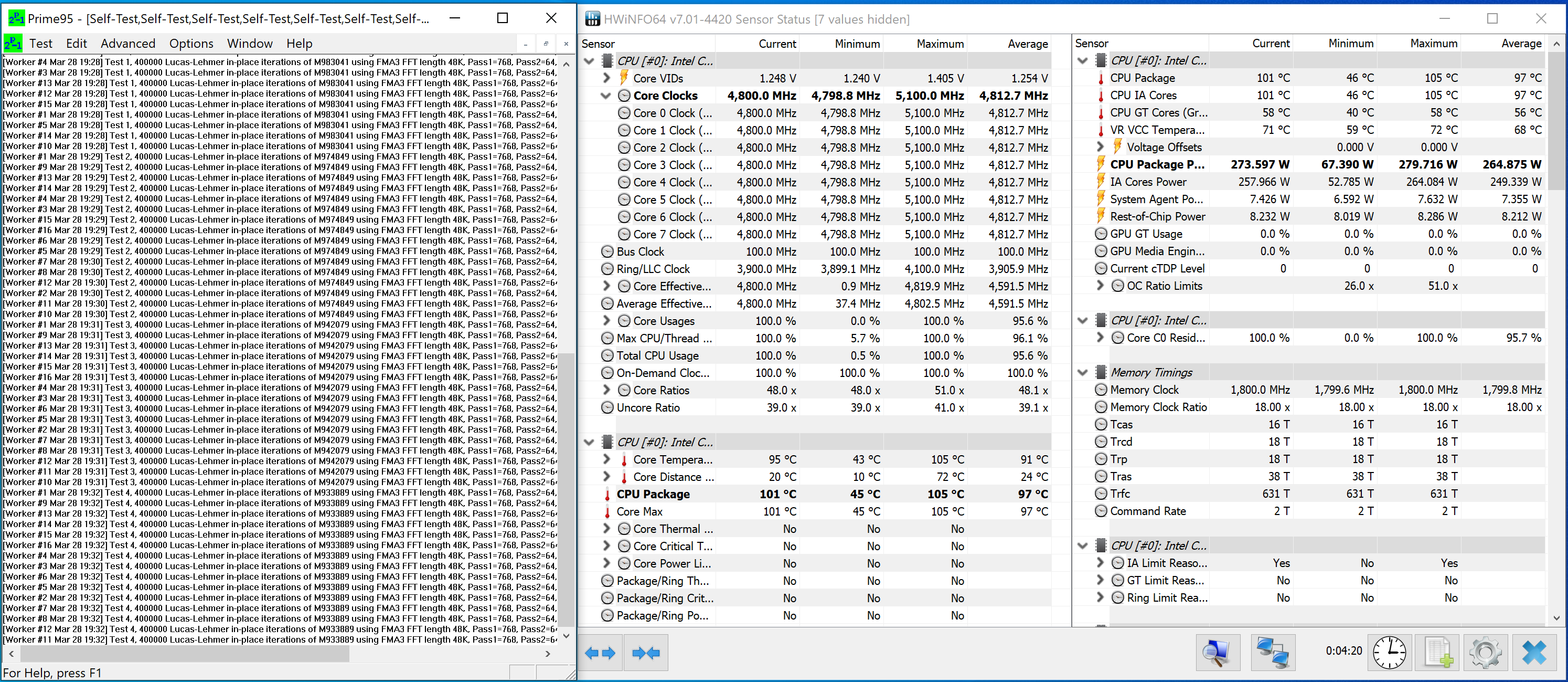 Для того же, чтобы стабильность сохранялась и в случае AVX2- и AVX-512-нагрузок, приходится применять сбрасывающие частоту поправки для множителя CPU, активирующиеся при исполнении соответствующих векторных инструкций. В нашем случае помогло снижение частоты на 300 и 500 МГц соответственно. То есть стабильность при исполнении AVX2-инструкций достигалась при 4,8 ГГц, а при исполнении AVX-512 – при 4,6 ГГц. Рабочие температуры процессора в этом случае сохранялись на приемлемом уровне – около 100 градусов. Однако не нужно забывать, что в нашей тестовой системе использовалось довольно мощное кастомное жидкостное охлаждение с 360-мм радиатором в контуре.