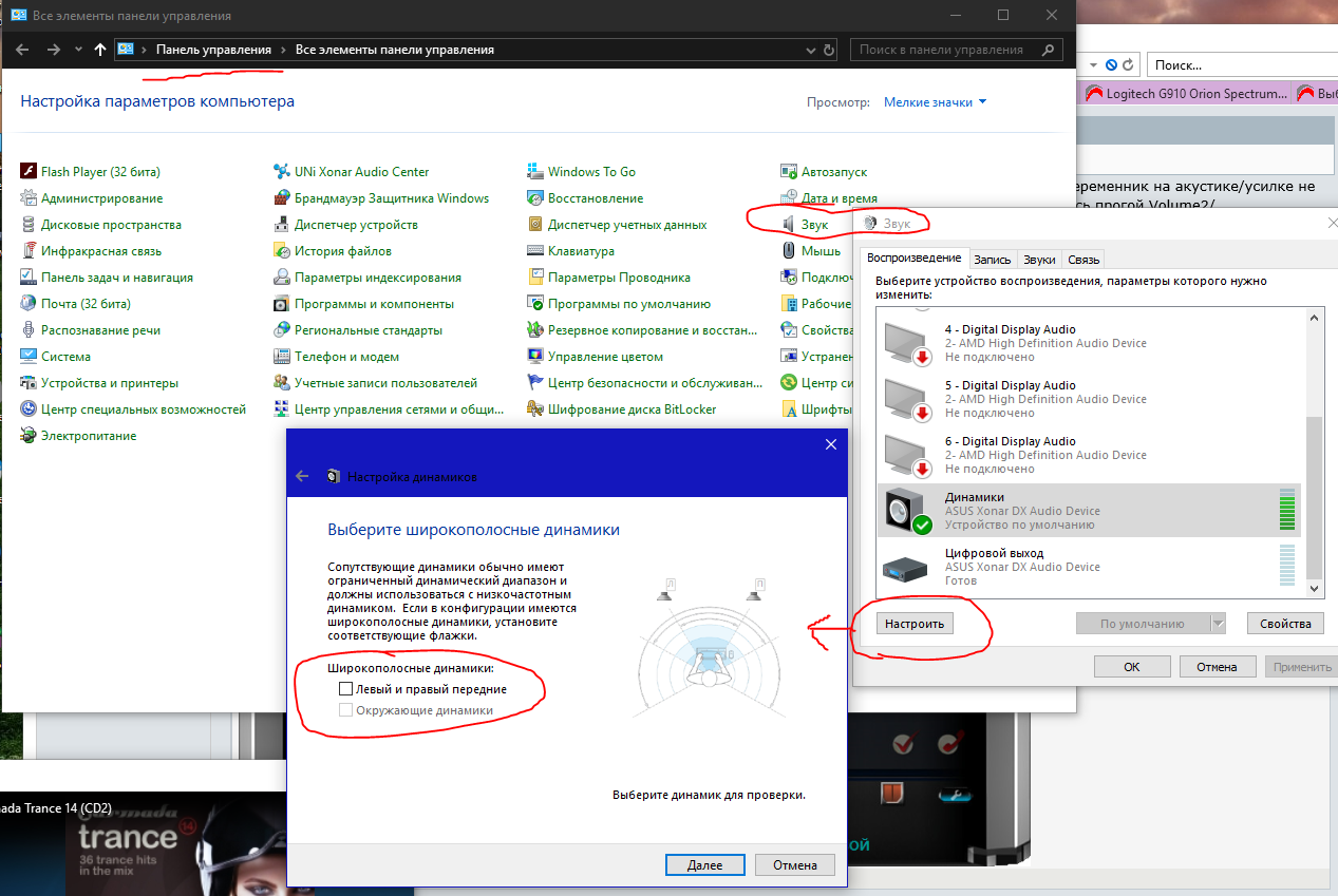 укажите правильно тип динамиков в тех же настройках, чтобы не было "широкополосных"