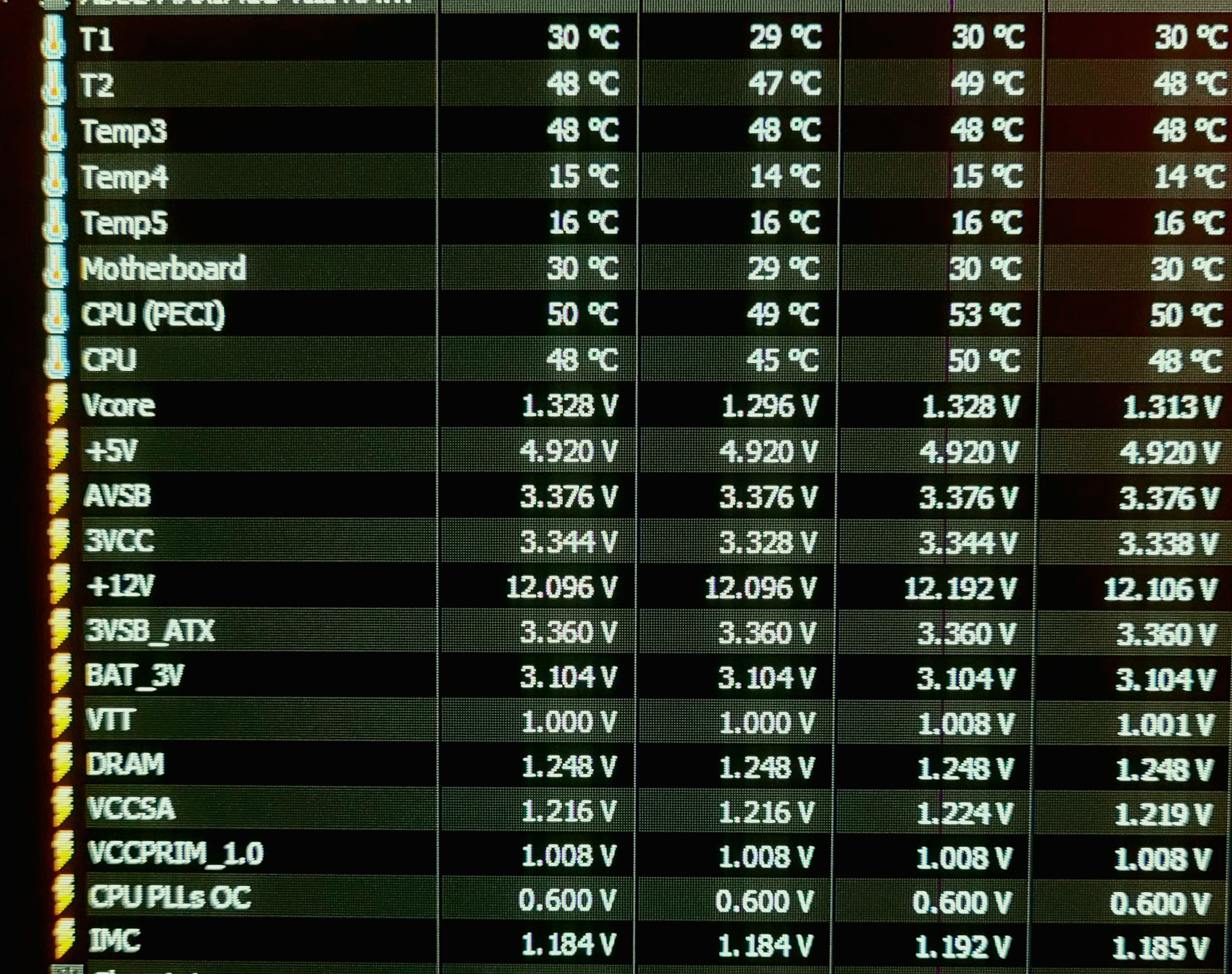 Значения в биосе, и под нагрузкой в мемтест5 экстрим. Скрин во время работы после 20минут. Повышение аппетита из-за нагрузки это понятно, но в биосе в момент простоя тоже значения расходятся. Выставлены ровные вольтаж 1.13750, но плата все равно выставляет сколько ей хочется. Можете объяснить?