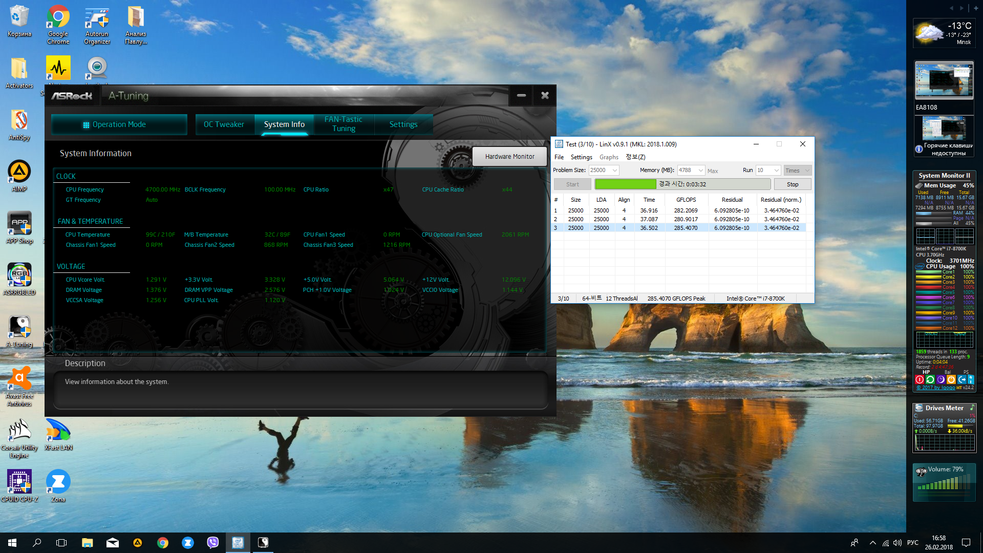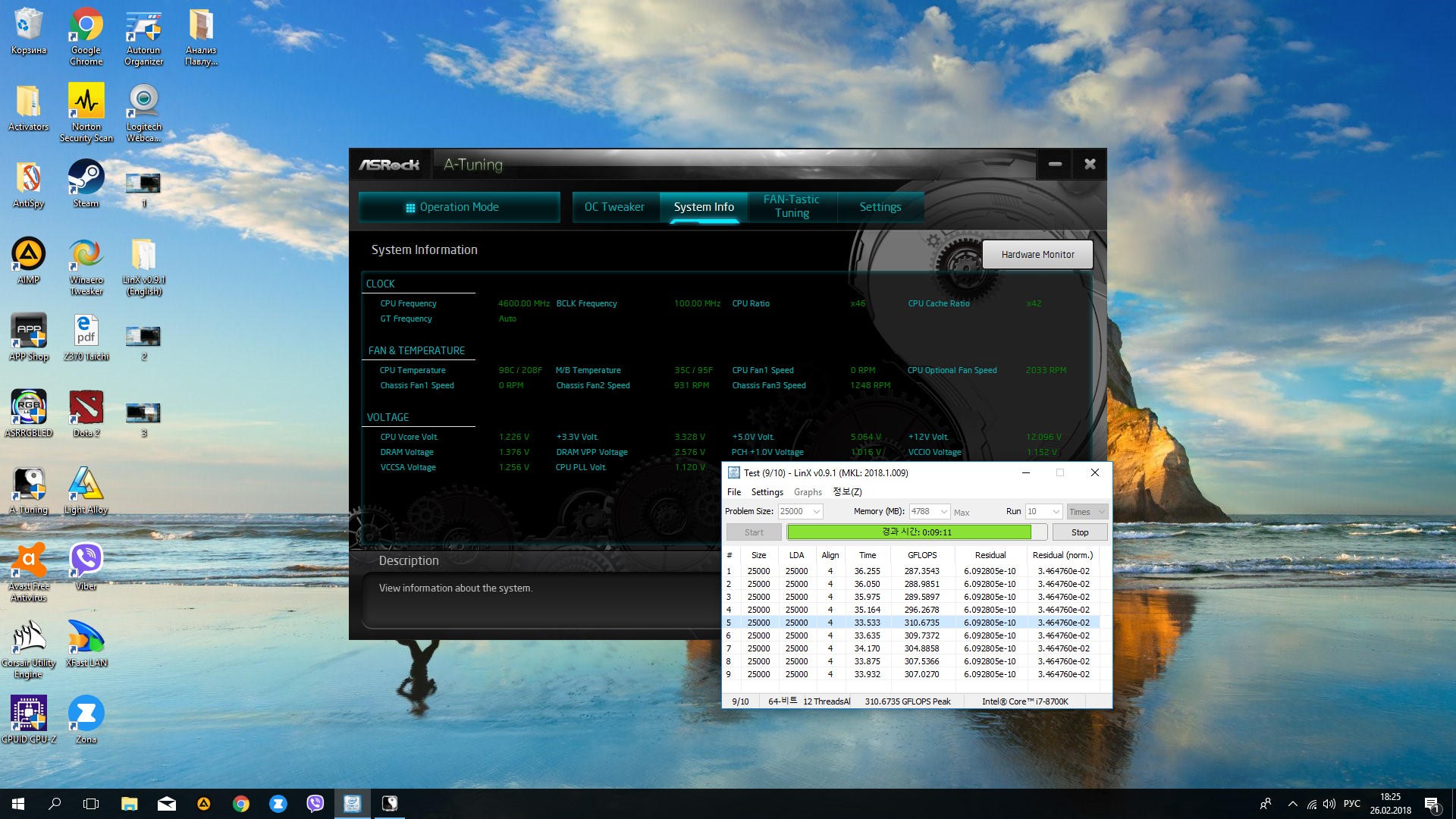 Получилось остановиться на множителе 46, напряжение 1.22, температура на последнем прогоне поднялась разово до 98, а так 93-95. тут еще может играет роль то, что я сижу на встроенной графике