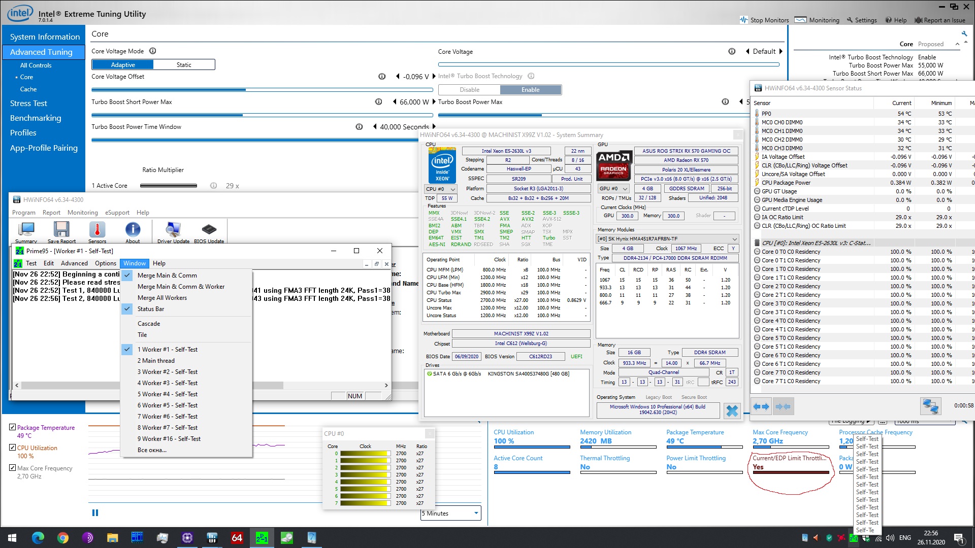 Мне нравится связка 2630lv3 + x99z v102. Вообще не переживаю из-за того, что мамка может сгореть, или из-за того, что на целых 300мгц (что менее 10%) этот проц медленнее полноценного 2630, который в 2.5 раза дороже. Но вот что можно сделать, чтобы победить Current/EDP limit throttling? Поделитесь мыслями, пожалуйста. На скрине прайм95 работает более 3х минут (пошла другая итерация), все 16 воркеров активны, частота кеша установлена на минимальную в биос, при этом проц стабильно держит 2700Мгц (с максимальной частотой кеша - 2600). Напрягает именно этот (со скриншота) лимит. Хочу 2900