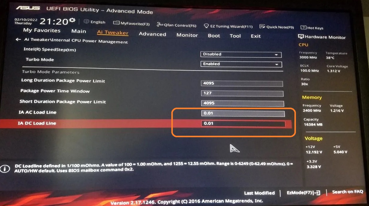 [ASUS] Убрать троттлинг на 2xxx биосах поможет значение «2.1» для настроек «IA AC Load Line» и «IA DC Load Line»