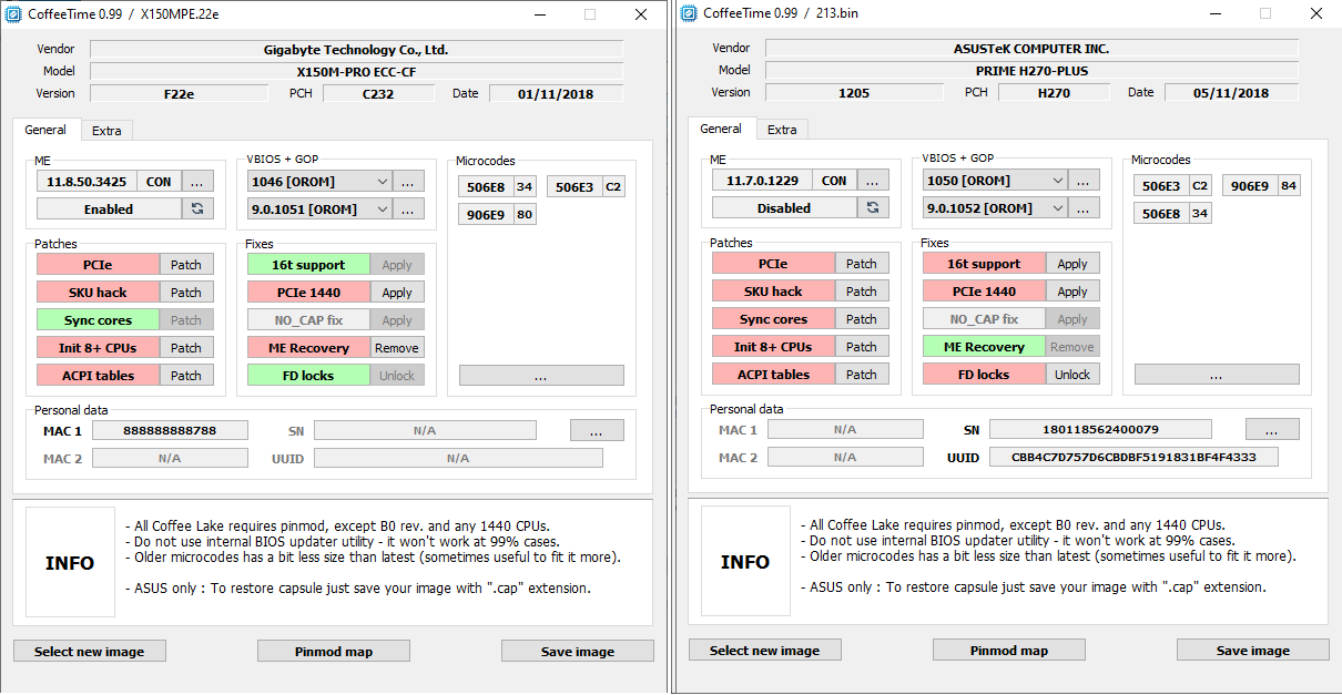 (!) Все порт-биосы не адаптированы под работу Xeon и "мутантов", необходимо в CoffeeTime 0.99 применить PCIe-патч, PCIe 1440 для ноутбучных 6-ядерных/12-поточных процессоров, COR ME и ME Disabled.