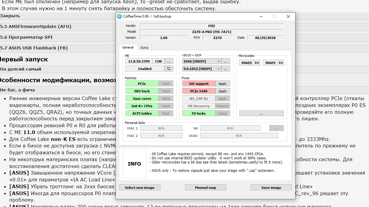 Скрин приложил. Не знаю как под спойлер закинуть В общем наткнулся на модбиос от Msi Z370A-Pro на 599 странице, обновил микрокоды и все запустилось! Подозреваю дело было в версии ME. Ранее не менял ее, оставалась 11.8.50.****. А в скаченном с 599 стр. стоял 11.7.**** Какие мысли братцы ? Может такое быть?. Имеет ли смысл в родном Биосе поменять версию " ME " и попробовать запустить? А то не нравиться как выглядит Биос от Z370 , ну и как то некрасиво от переходит от загрузки Биос в винду. Гаснет как старый телевизор, полосами.
