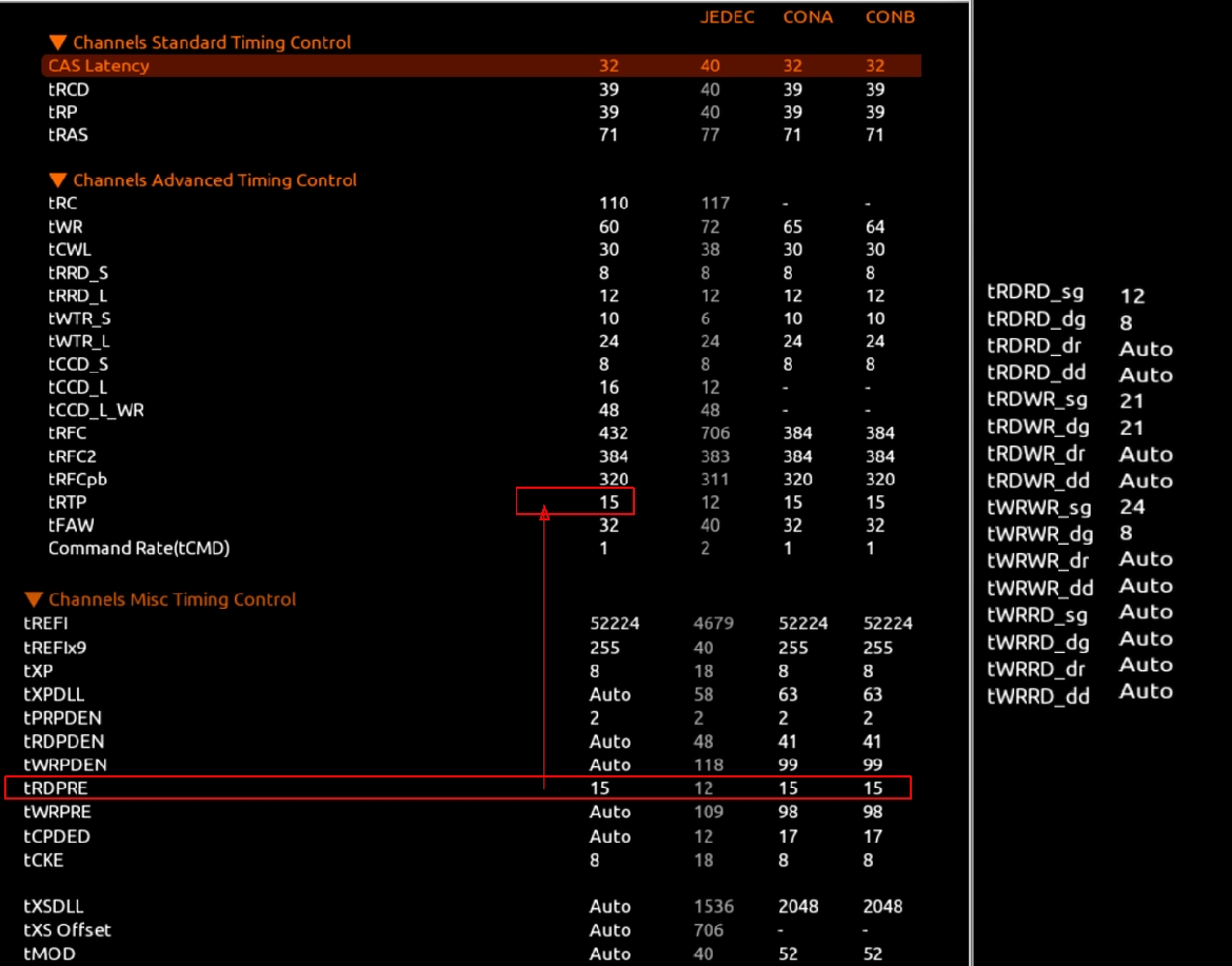 там гдет до 6133-6200 норм тренит, + как раз твоих Vdd/VddQ=VDD2CPU=InternalVCCSA=1.25v до +-6133-6200 должно хватать на хиниксах(про самсунги не в курсе), потом улетает тренировка, + посмотри&затести тему GIGABYTE LGA1700 на чипсете Intel Z690 (Alder Lake-S) #17780199 , я на 20ом не экспериментил ибо у меня AMDвидеокарта(RX) не инициализируется в первом слоте с ним, только во втором, а на других биосах у меня round trip latency не работает с DDR5. + на гиге лучше не экспериментить особо с занижениями(правда я с СR2 не экспериментил) для 32-39, чтот в таком↓ духе(токо с СR2 в твоём случае) желательно начинать
