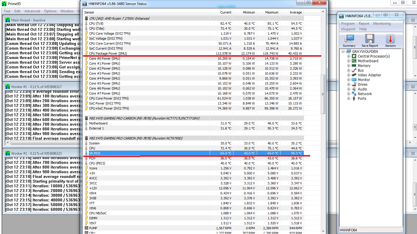 Не хочу Вас расстраивать, но на Вашей плате просто НЕТ датчика температуры на VRM. Там где написано Motherboard - это НЕ VRM! это где-то в другой части платы. Ryzen 2700X + MSI x470 GAMING PRO CARBON + 5 x 120 вентиляторов в корпусе. VRM - 5 сдвоенных фаз. 57`С после 2-х каток в танках Думаю у Вас 4 фазы греются где-то - от 80`C и до расплава