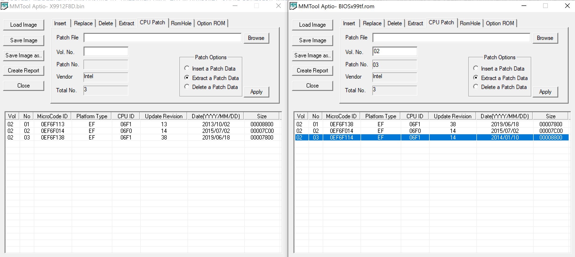 Вы предлагаете строку 3 (см правый скриншот) из биоса от TF выгрузить и загрузить вместо строки 1 (см левый скриншот) в биосе F8D ? То есть поменять ревизию это микрокода ?