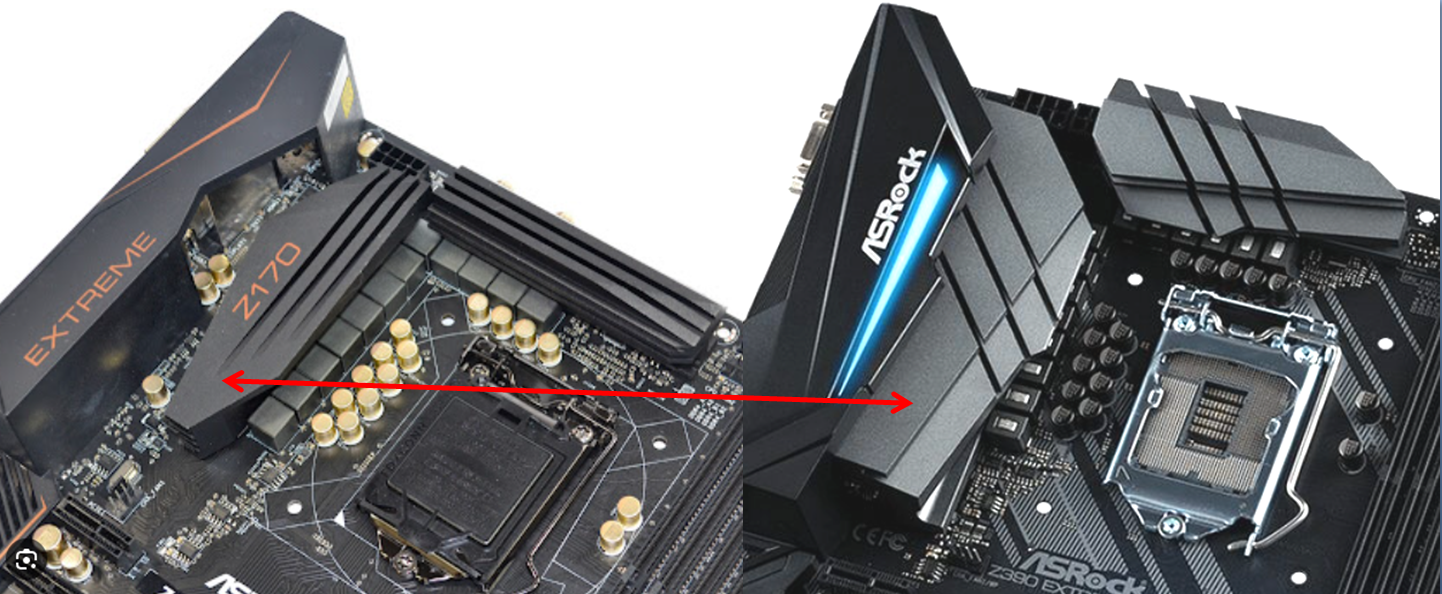 Посмотрите только на эту игрушечную систему охлаждения мосфетов питания CPU у Asrock Z170 Extreme4 против Asrock Z390 Extreme4 (греется именно боковая система питания и ее радиатор, где написано Z170, верхний радиатор питания всегда остается холодным).