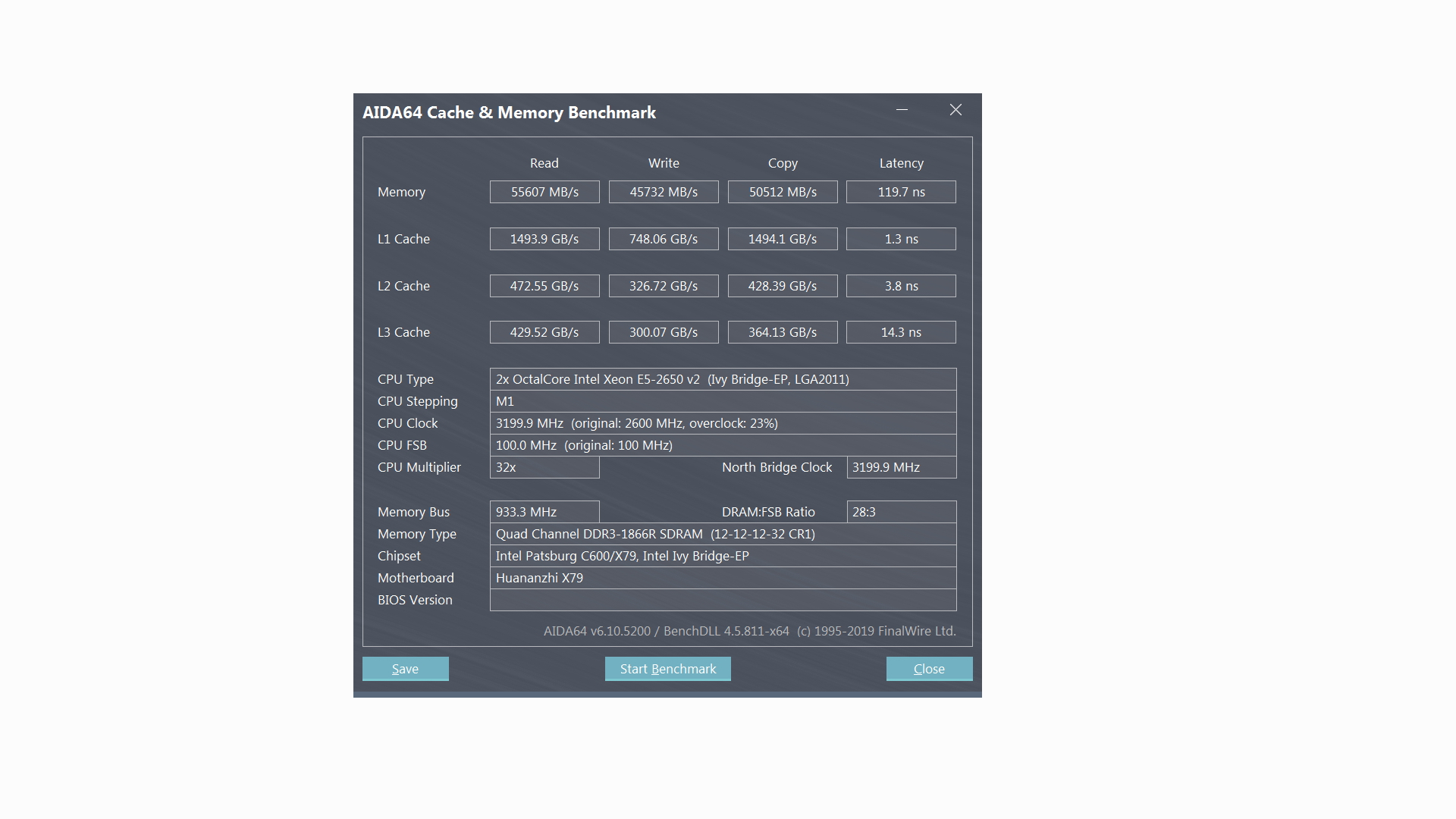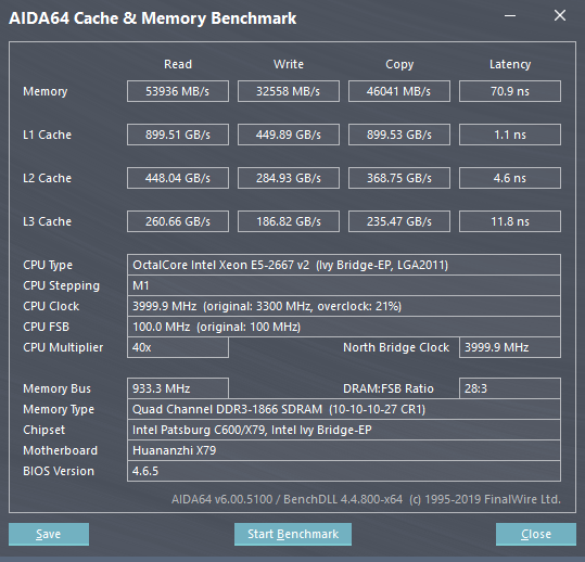 Добрый день. Нужна помощь в решении одной проблемы. Есть материнская плата Huanan X79 Dual которая с двумя CPU типа Xeon E5-2650V2. На этой матери стоит 4 планки оперативной памяти по 8Гб типа HMT31GR7EFR4C-RD T8 от фирмы Kcmsywjr с частотой 1866 МГц. И всё бы нормально но вот не вытягивает моя система производительности подобных моей системы. Сделал тест в Аиде и получил такие результаты: