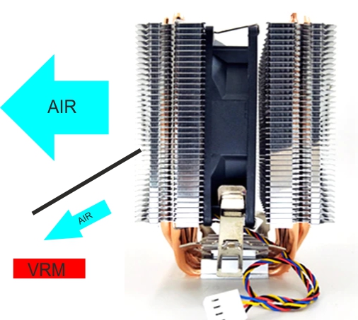 Для начала я бы просто вырезал кусок пластика или жести и прилепил на ваш снеговик в нижней части, чтобы отклонялась часть воздушного потока и дула на vrm. Тем более башенные кулеры с таким конструктивом есть. Вот примерно так:
