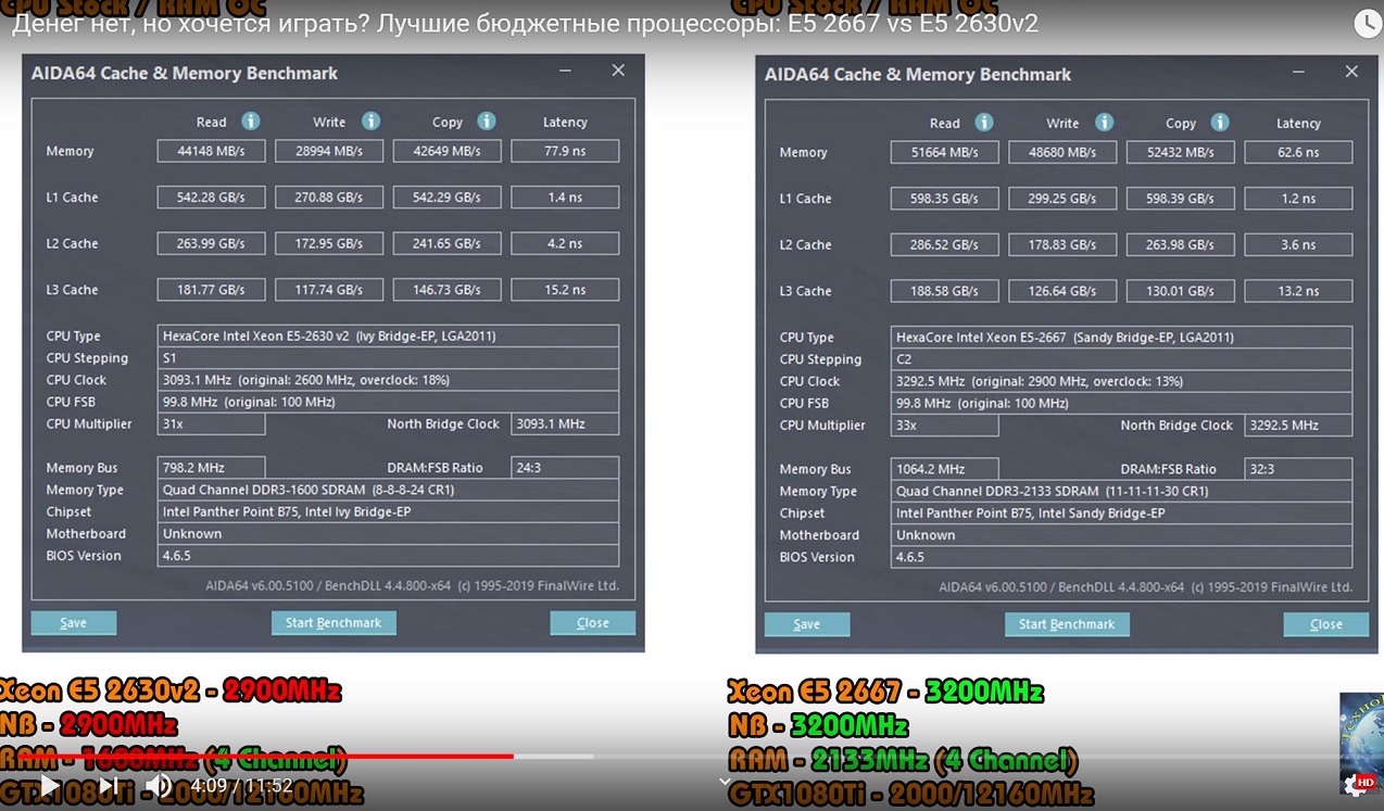 Достигаемая частота памяти - это как повезет. И зависит как от материнки и плашек озу, так и конкретного экземпляра процессора и в разных комбинациях может давать разный результат (как пример у меня есть Делюкс 6.11 на которой шитые самсунги F8 работали с 2650v2 вплоть до 1866МГц, а с 1650v2 работать отказались даже на 1333, при этом прекрасно работая с другой памятью в 4х канале на 1866), а просадки сделаны специально, это 100% (а вот с какой целью это уже только автор видео знает). Она (просадка) вполне может быть в пределах 44 чтение, 40 запись, но не такая как там показано.