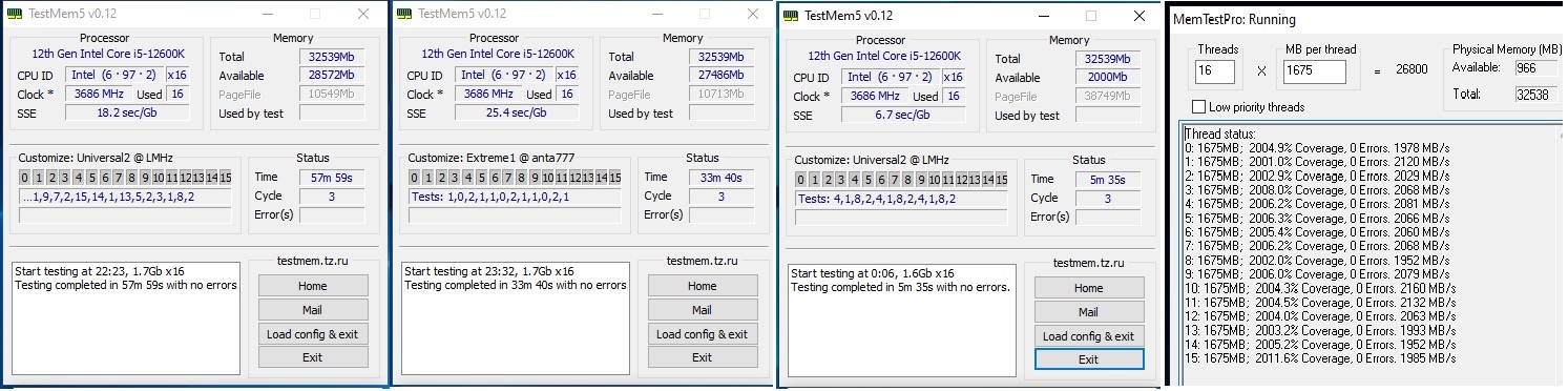 Этих конфигов для проверки будет достаточно, чтобы убедиться в стабильности работы ОЗУ или лучше запустить еще такие: Linpack Xtreme -1.1.5, OCCT ver. 11. Эта утилита эффективна: MemTest PRO 7.0? Плохо, что она очень долго выполняет полный тест.