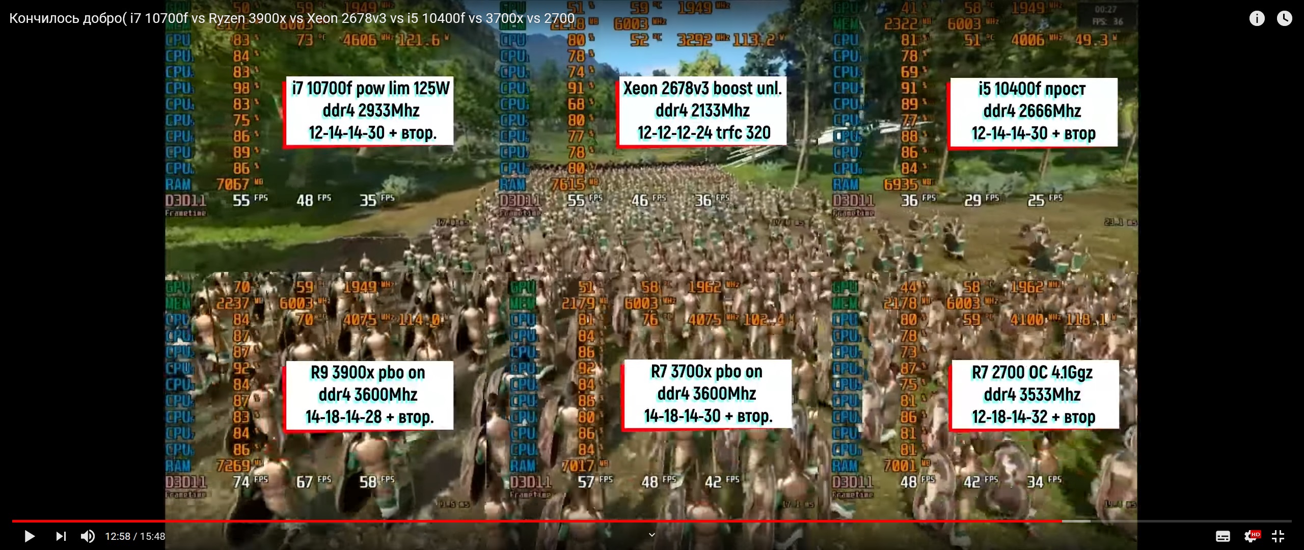 Как раз в это я верю. Это как бы логично что 4 ядра на 14нм жрут меньше чем 12ядер на 22нм, я про преимущество от 15% до 30%. Просто я замечал загрузку свого проца свыше 80% при отключенном гипертрейдинге в некоторых играх. А ведь даже без HT этот камень минимум в 2 раза быстрее 10100 по общей производительности. Логика мне подсказывает что 10100 в этих местах должен быть под 100% загружен и выдавать меньший фпс. Возможно каким-то чудесным образом более новая архитектура, меньшие задержки это компенсируют, но те тесты которые я видел показывают, что skylake максимум на 15% быстрее haswell на одинаковой частоте. А есть тесты Геркона которые вы кажется видели, где он идёт практически на равных с восьмиядерным 10700f в том же TotalWar TROY на ультрах, и там 10400ф совсем в попе, что уж было бы с 10100ф? Кстати рекомендую вам обратить внимание на потребление камней в том же тесте. Тут выше отписывались что зионы старые кипятильники, а ведь под полной нагрузкой он жрёт меньше чем 8 ядерный 10700ф на 14+++++++ нм, меньше чем 2700x на 12 нм и выдаёт ту же или выше производительность, и меньше чем 12 ядерный 3900х, хоть и отстаёт по фпс, при этом температуры на уровне залоченого 10400ф. Я не знаю что тут добавить. При этом меня лично совсем не заботит само потребление проца, только температуры, но даже в потреблении он хорош.