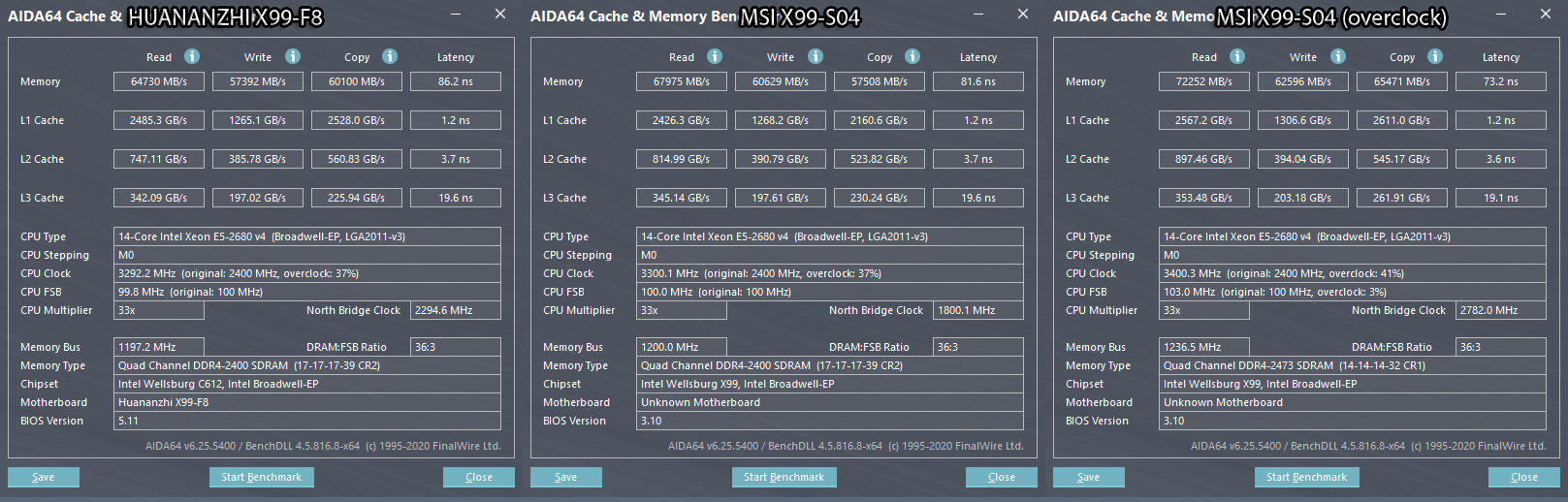 Тест скорости памяти X99-F8 (сток), MSI X99-S04 (сток), MSI X99-S04 (разгон)