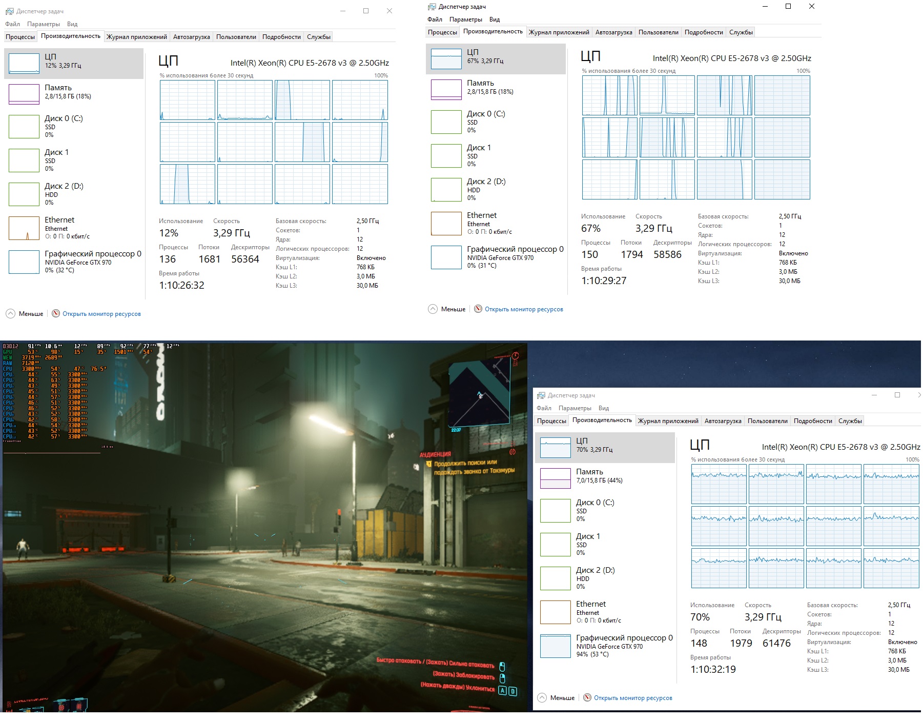 Но как видите этого не происходит, т.к. играм достаточно 4-х быстрых ядер. И часто никакого толка от 12-ти медленных ядер нет, т.к. игра по факту их не использует. То что Вы видите загрузку всех 24 потоков - это работа ОС, а не хорошая оптимизация игры под 24 потока.
