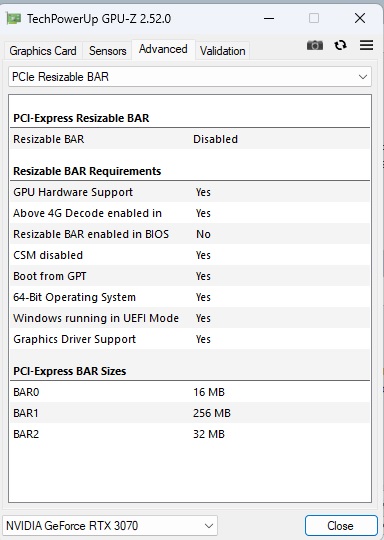 Да, я со всей пачкой видеокарт что у меня есть попробовал. Для 6600xt SAM не включается, для 3070 и 3080 ReBar. Вот пример с 3070 как это выглядит.