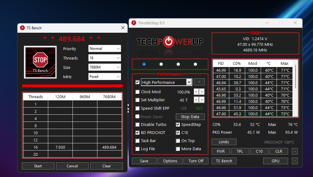 Прогнал бенч из Throttlestop, температуры подросли конечно, максимальная теперь 76 и TDP до 93 Ватт