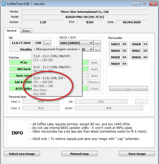 Для плат на базе чипсетов Z370, B365 и H310C можно добавить поддержку процессоров Skylake и Kaby Lake. Для этого достаточно понизить версию МЕ и добавить необходимые микрокоды.
