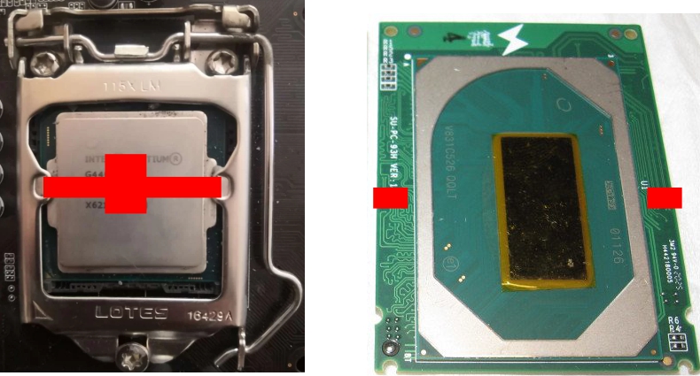 у серийника лапки крышки-рамки прижимают крышку кристалла, а тот по всему периметру равномерно передает всю нагрузку на подпружиненную сокетом подложку. У мутанта эти наплывы действительно неравномерно давят на две точки текстолита подложки-переходника по бокам... странное решение, не продуманное до конца. Возможно, наверное, что одна из сторон без наплыва может получать чуть меньший прижим... Пока в руки не возьму его, конечно, не станет понятно.