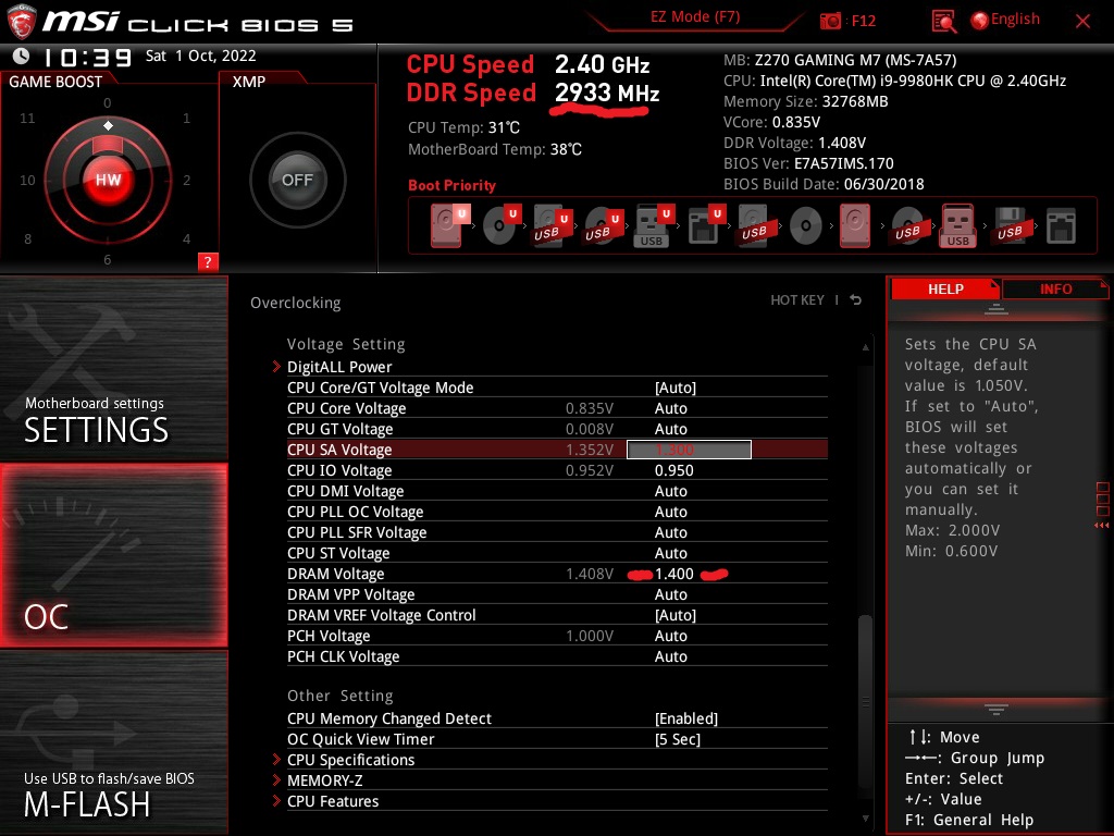 Я увеличил напряжение оперативной памяти до 1,4 В, а sa\co - до 1,3